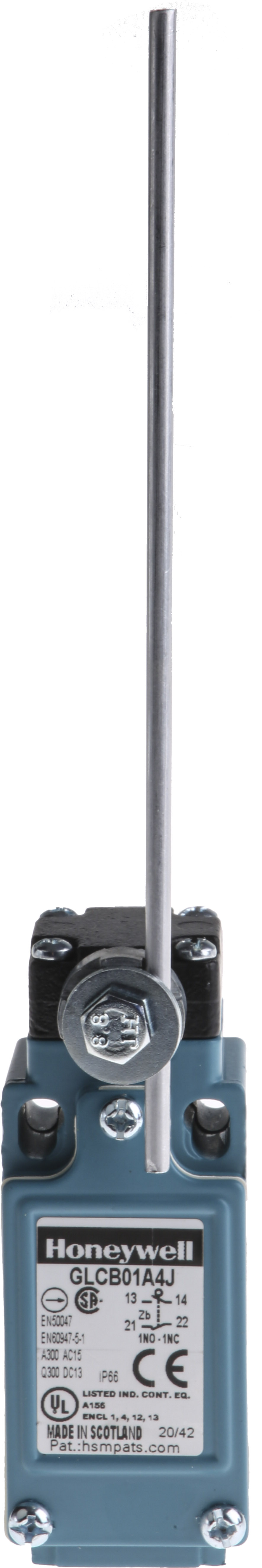 This is IP66 Snap Action Limit Switch Adjustable Lever Die Cast Zinc NO/NC 300V manufactured by Honeywell. The manufacturer part number is GLCB01A4J. It has 300v maximum DC voltage. A bespoke product carries 300v of maximum AC voltage. It has a 0.12 nm of operating force. The product complies with all safety standards, such as ccc, ce, csa c22.2 no. 14, en/iec 60947-5-1, ul 508. It also carries 10a maximum current. It is IP rated with ip66. The product glc, is a highly preferred choice for users. Additionally, it performs a snap action type action . Its accurate length is 68.5mm. It has spdt 1no/1nc pole and throw configuration. The product also features robust die cast zinc housing material. Furthermore, the product is 30.5mm wide. The product comes in 26.35mm depth. Whereas, its mounting orientation is en50047 . The product carries rod actuator. The normal state configuration includes no/nc. The product also provide mechanical stability with 10000000cycles. It has a maximum operating temperature of +85°c. Whereas, the minimum operating temperature of the product is -40°c. It allows pg13.5 connection type.