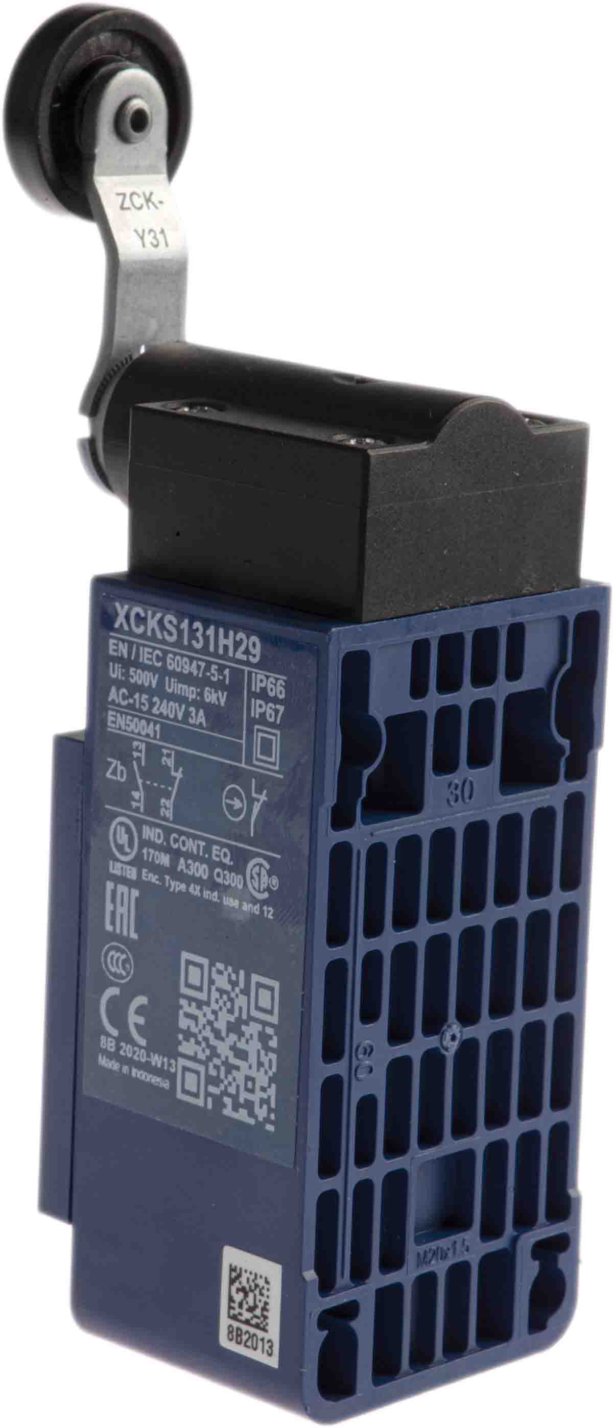 This is IP65 Snap Action Limit Switch Lever Plastic NO/NC 240V manufactured by Telemecanique Sensors. The manufacturer part number is XCKS131H29. It has 250v maximum DC voltage. A bespoke product carries 240v of maximum AC voltage. The product carries roller lever actuator. It also carries 3a maximum current. It is IP rated with ip65. The product xcks, is a highly preferred choice for users. Additionally, it performs a snap action type action . Its accurate length is 72.5mm. It has dp pole and throw configuration. The product also features robust plastic housing material. Furthermore, the product is 40mm wide. The product comes in 36mm depth. The normal state configuration includes no/nc. The product also provide mechanical stability with 20000000cycles. It has a maximum operating temperature of +70°c. Whereas, the minimum operating temperature of the product is -25°c. It allows m20 connection type.