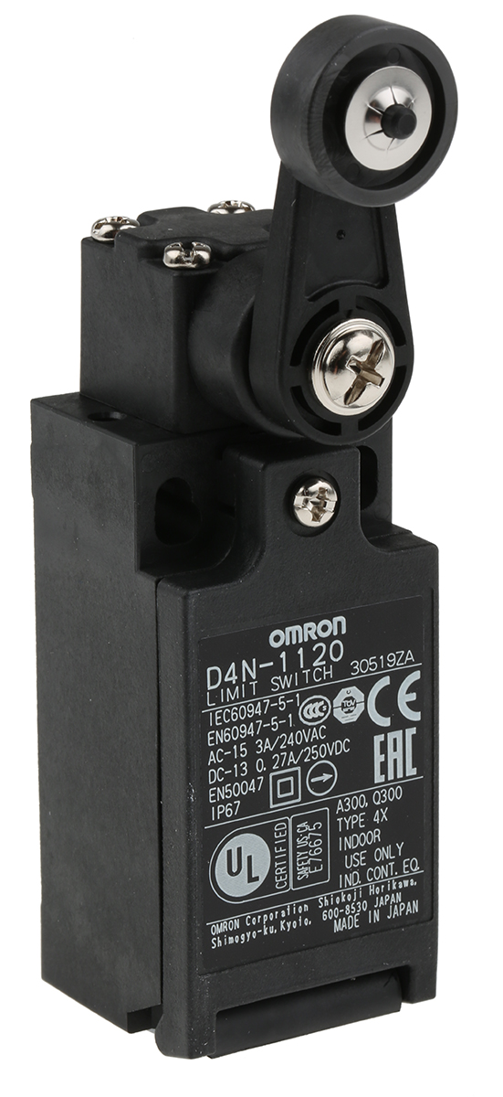 This is D4N Safety Switch with Roller Lever Actuator NO/NC manufactured by Omron. The manufacturer part number is D4N-1120. A bespoke product carries 250v of maximum AC voltage. It has a 5 n of operating force. The product complies with all safety standards, such as csa, culus, ul. It is IP rated with ip67. The product d4n, is a highly preferred choice for users. Additionally, it performs a snap action type action . Its accurate length is 73mm. It has spdt pole and throw configuration. Furthermore, the product is 31mm wide. The product comes in 47mm depth. The product carries roller lever actuator. The normal state configuration includes no/nc. The product also provide mechanical stability with 15000000cycles. It has a maximum operating temperature of +70°c. Whereas, the minimum operating temperature of the product is -30°c. It allows pg13.5 connection type.