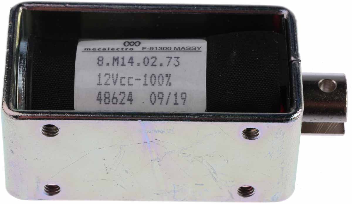 This is Pull Action DC D-Frame Solenoid 12mm stroke 10.5W 12 V dc manufactured by Mecalectro. The manufacturer part number is 8.M14 02 73 12 VCC 100%. Concerning its action options, it allows pull action. Features 12 v dc supply voltage. It has about 12mm stroke maximum . The given dimensions of the product include 57.7 x 32 x 25.4. It has the capability to hold 2 → 8n force.