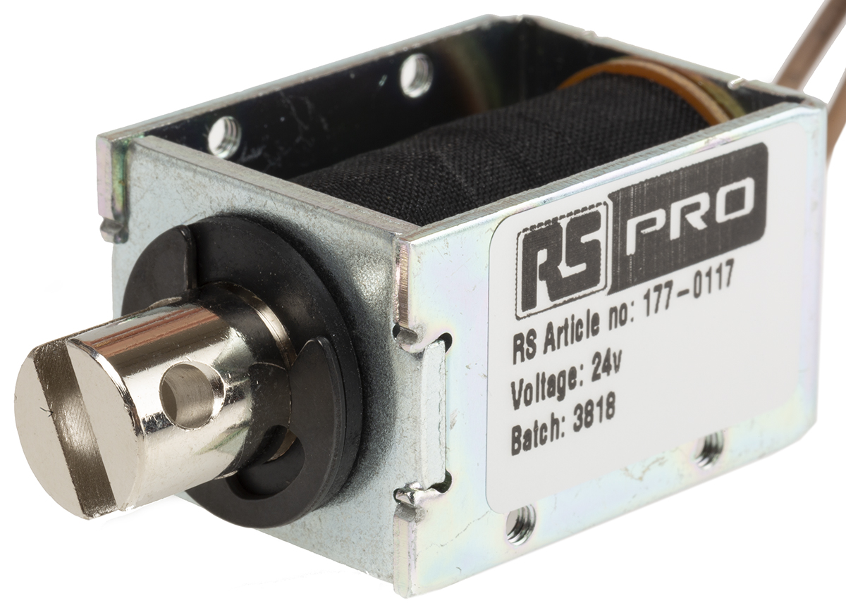 This is DC D Frame Solenoid 24v manufactured by RS Pro. The manufacturer part number is 177-0117. Concerning its action options, it allows pull action. The given dimensions of the product include 40 x 24 x 29 mm. Features 24 v dc supply voltage.
