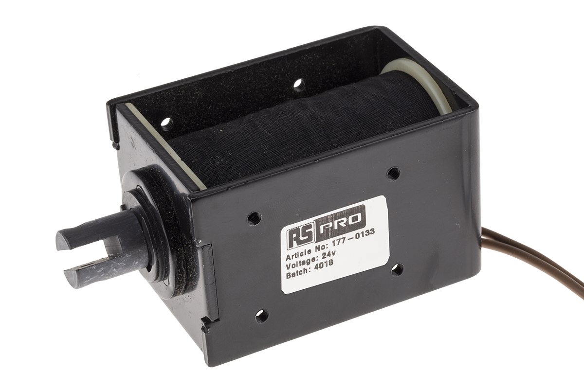 This is Pull Action DC D-Frame Solenoid 24 V manufactured by RS PRO. The manufacturer part number is 177-0133. Concerning its action options, it allows pull action. The given dimensions of the product include 84 x 52 x 58 mm. Features 24 v dc supply voltage.