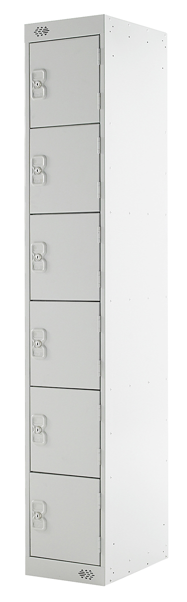 This is 6 Door Steel Grey Industrial Locker 1800 mm x 300 mm x 450mm manufactured by RS Pro. The manufacturer part number is 521-370. It contains 6 dedicated doors . It has a decent grey colour. The product is made from highly stable and reliable steel. It has an external depth of 450mm. While its external height is 1800 mm. The product is 300 mm wide.