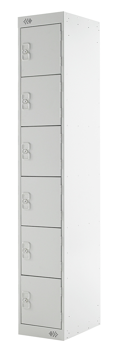 This is 6 Door Steel Light Grey Storage Locker 1800 mm x 300 mm x 300mm manufactured by RS Pro. The manufacturer part number is 833-2926. It contains 6 dedicated doors . It has a decent light grey colour. The product is made from highly stable and reliable steel. It has an external depth of 300mm. While its external height is 1800 mm. The product is 300 mm wide.