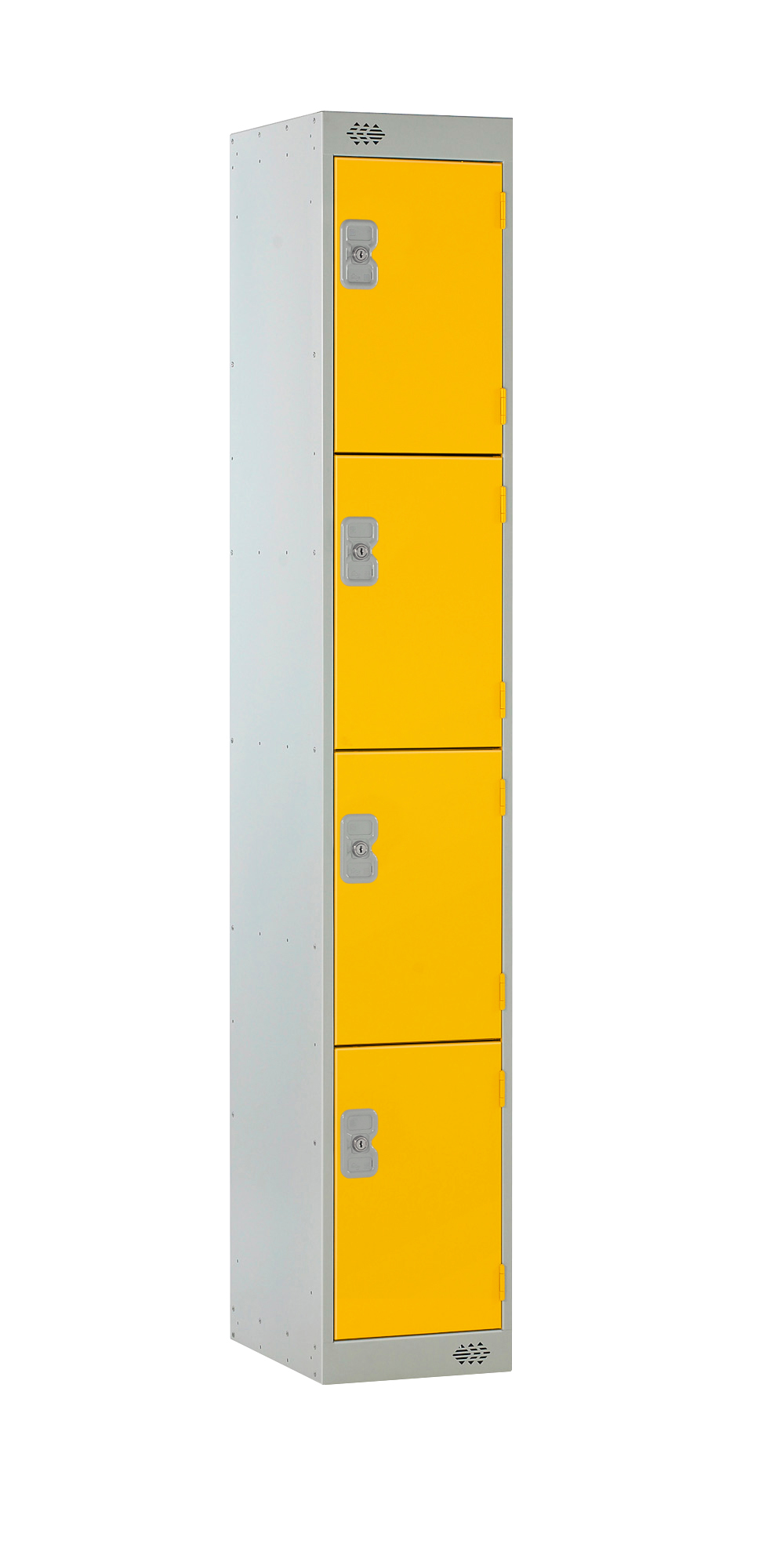 This is 4 Door No Steel Yellow Locker 1800 mm x 380 mm x 450mm manufactured by RS PRO. The manufacturer part number is 213-475. It contains 4 dedicated doors . It has a decent yellow colour. The product is made from highly stable and reliable steel. It has an external depth of 450mm. While its external height is 1800 mm. The product is 380 mm wide. In addition, it is vented no .
