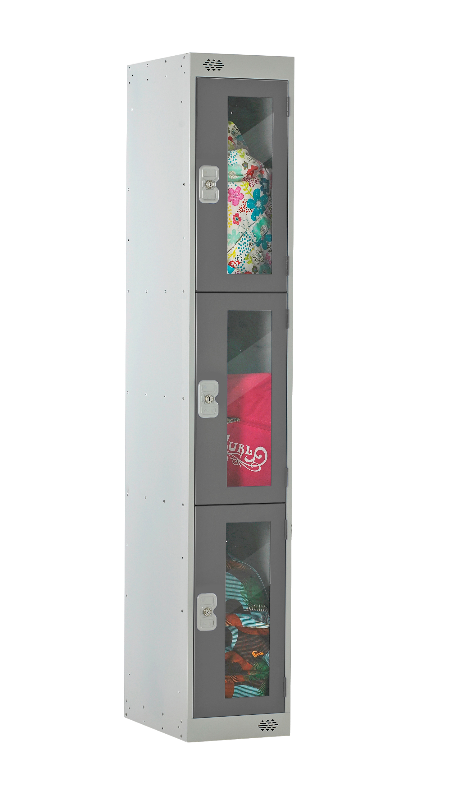 This is 3 Door No Steel Dark Grey Locker 1800 mm x 300 mm x 450mm manufactured by RS PRO. The manufacturer part number is 214-264. It contains 3 dedicated doors . It has a decent dark grey colour. The product is made from highly stable and reliable steel. It has an external depth of 450mm. While its external height is 1800 mm. The product is 300 mm wide. In addition, it is vented no .