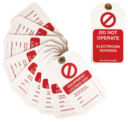 This is 10 x 'Do Not Operate Electrician Working Equipment Locked Off' Lockout Tag manufactured by Martindale. The manufacturer part number is RSTAG4. Applications Information involves safety identification and lockout. It contains 10 item per package . do not operate, electrician working, equipment locked off is the tag message exhibited by the product .