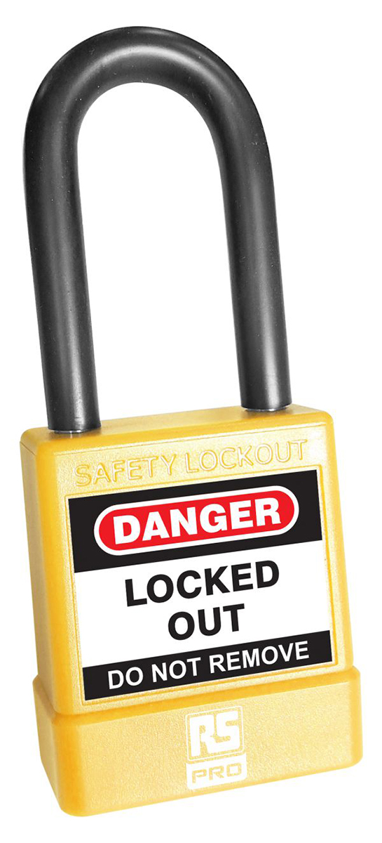 This is ES - PLSP 6 - Steel Shackle with PVC Sle manufactured by RS PRO. The manufacturer part number is 180-6819. Its shackle is about 48mm in length . It has a decent yellow colour. The product is made from highly stable and reliable steel. It comes in safety padlocks configuration.