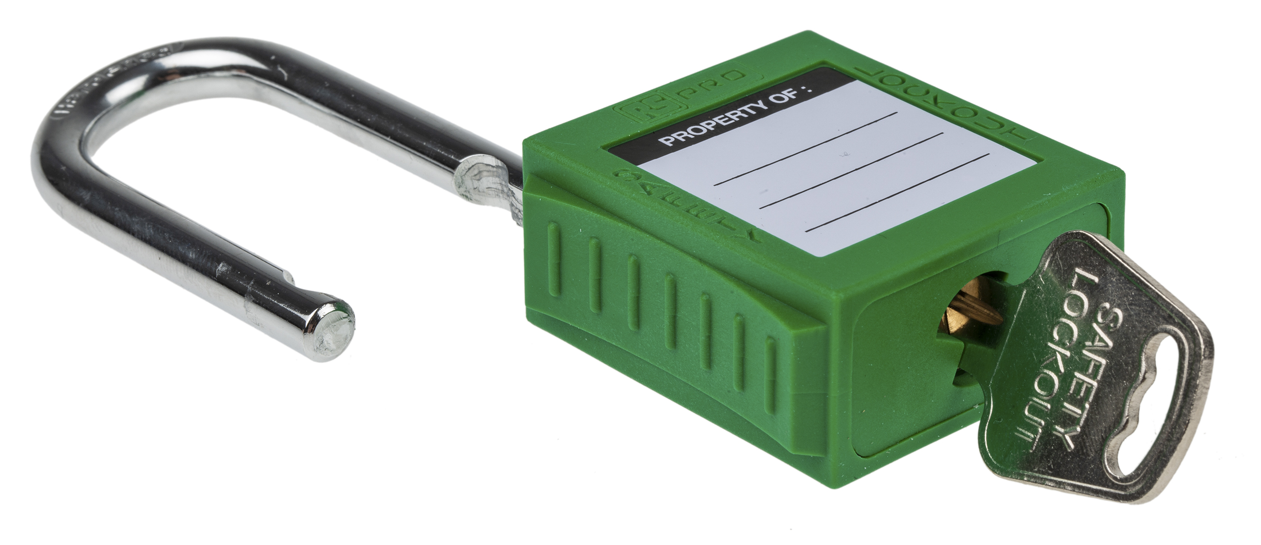 This is All Weather Safety Padlock 38mm manufactured by RS PRO. The manufacturer part number is 196-3754. It includes 1 number of locks . The product has a Risk Type of mechanical It has a decent green colour. The product is made from highly stable and reliable nylon, steel. Its shackle is about 38mm in length . Additionally, it has a standard 6.35mm lock shackle maximum diameter . The product is highly suitable for lockout device. It comes in safety lockout configuration.