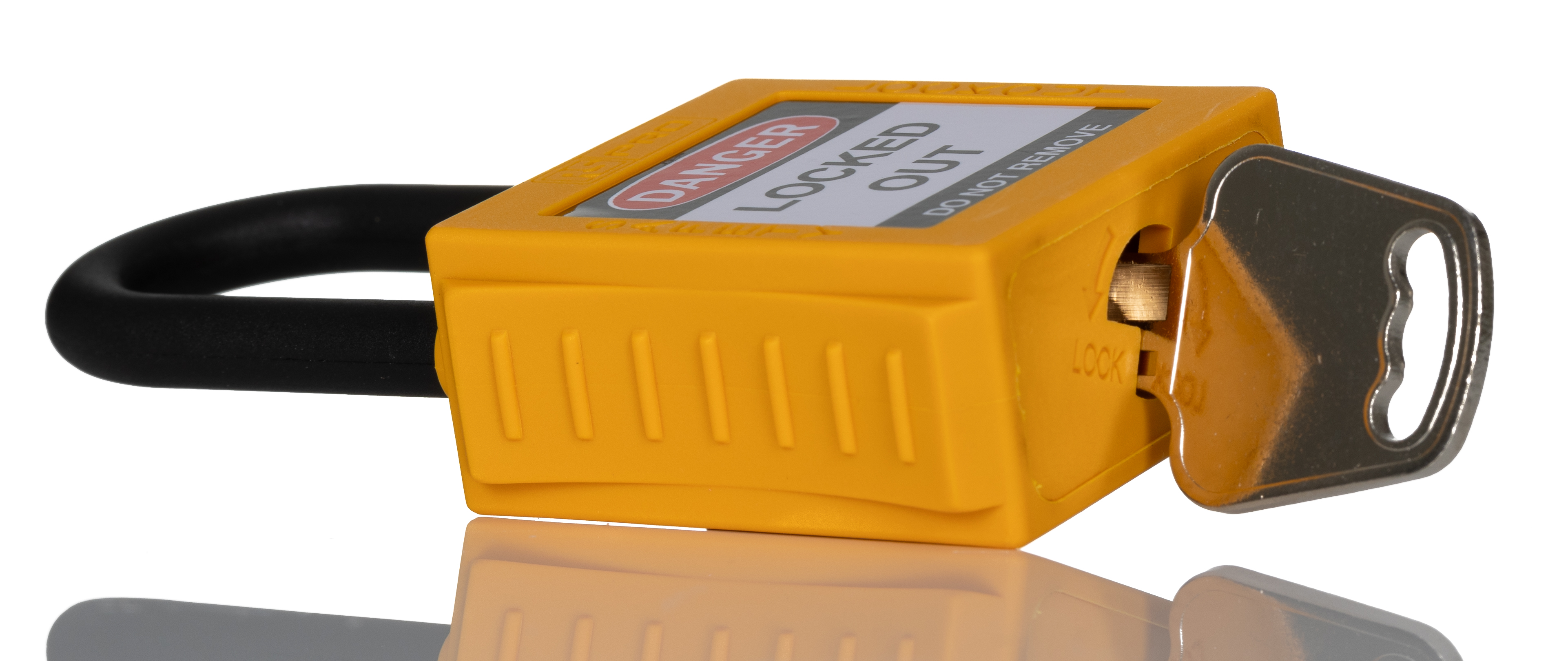 This is All Weather Safety Padlock 38mm manufactured by RS PRO. The manufacturer part number is 196-3763. It includes 1 number of locks . The product has a Risk Type of mechanical It has a decent yellow colour. The product is made from highly stable and reliable nylon. Its shackle is about 38mm in length . Additionally, it has a standard 6.35mm lock shackle maximum diameter . The product is highly suitable for lockout device. It comes in safety lockout configuration.