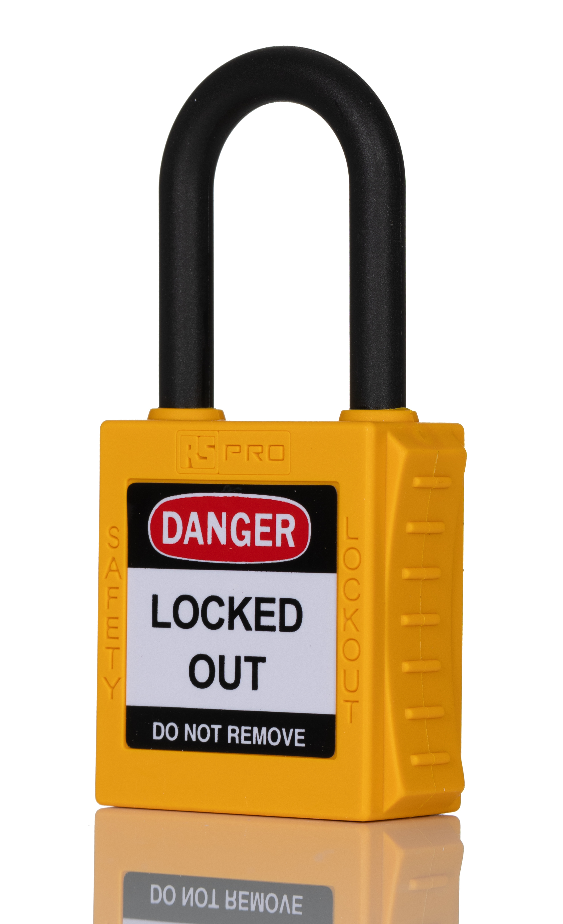 This is All Weather Safety Padlock 38mm manufactured by RS PRO. The manufacturer part number is 196-3763. It includes 1 number of locks . It has a decent yellow colour. The product is made from highly stable and reliable nylon. Its shackle is about 38mm in length . Its overall shackle diameter is approximately 6.35mm . lockout is a versatile product designed to provide user-defined applications. Its sub type is safety lockout .