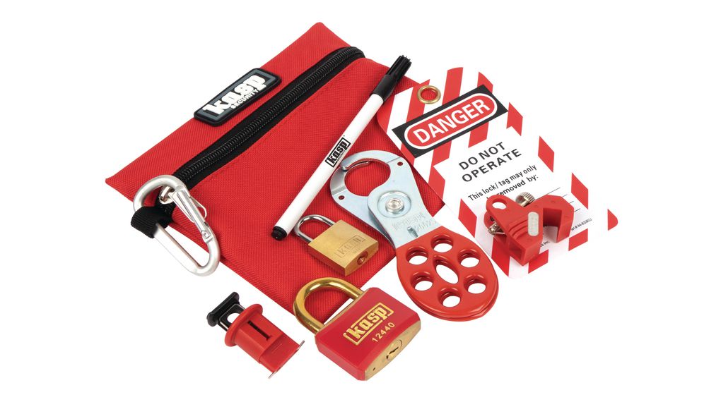 This is Red Silver Brass Steel Fuse lock-off device MCB manufactured by Kasp. The manufacturer part number is K81300. It includes 5 number of locks . It has a decent red colour. It comes in electrician lockout kit configuration.