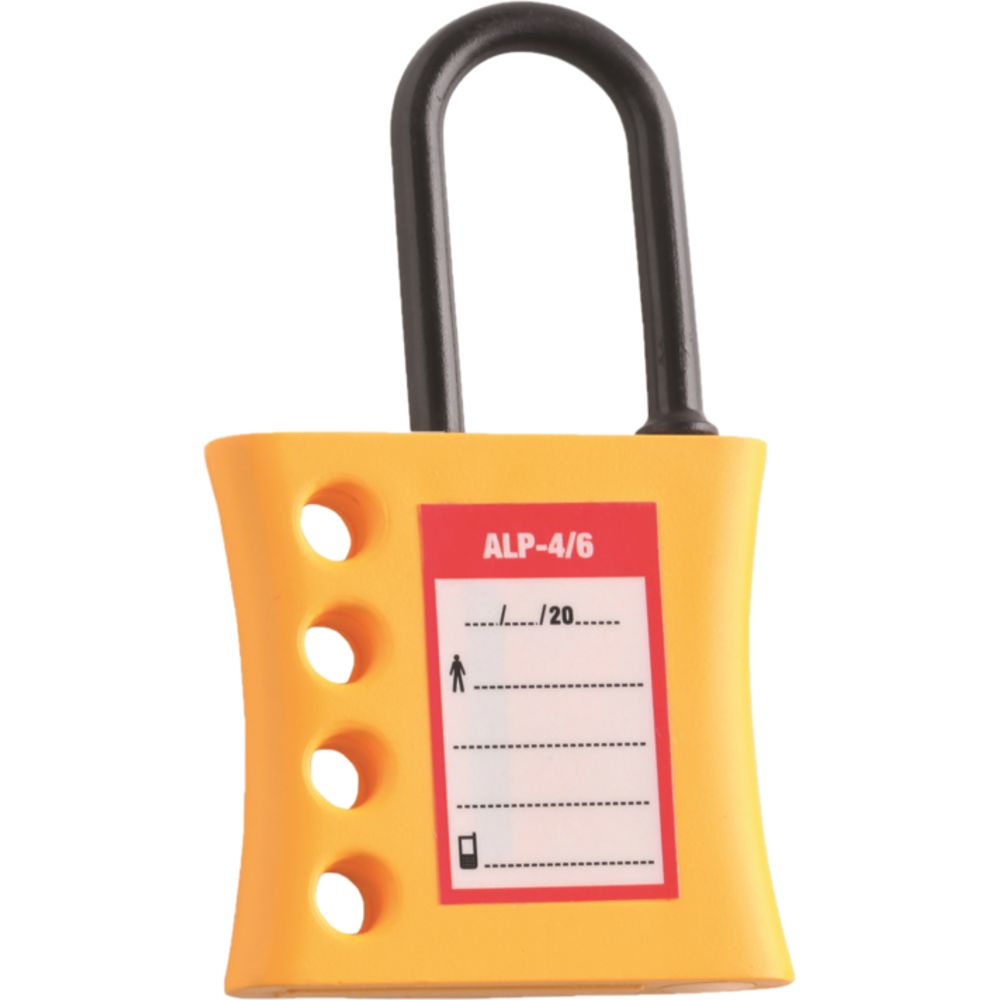 This is Yellow 4-Lock Plastic Lockout Hasp 6mm Shackle 8mm Attachment manufactured by Catu. The manufacturer part number is ALP-4/6. It includes 4 number of locks . Moreover, it has an attachment point of 8mm maximum size . It has a decent yellow colour. The product is made from highly stable and reliable plastic. It has an attachment point of 6mm of minimum size . Additionally, it has a standard 6mm lock shackle maximum diameter . It comes in lockout hasp configuration.