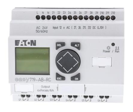 This is EASY Logic Module 24 V ac 12 x Input 6 x Output With Display manufactured by Eaton. The manufacturer part number is EASY719-AB-RC. Additionally, the product is supplied with 6 outputs. The given dimensions of the product include 110 x 107.5 x 58 mm. The product is available in din rail configuration. Whereas, the minimum operating temperature of the product is -25°c. The product easy, is a highly preferred choice for users. It has a/an logic control module type module . Its accurate length is 110mm. Furthermore, it has arelay output. Furthermore, the product is 107.5mm wide. The product comes in 58mm depth. Features 24 v ac supply voltage. It carries analogue, digital input type. The product is designed with a screw termination. It is designed with a typical easynet type network . It has a maximum operating temperature of +55°c. It carries 8 a output current. Display included yes . The product consists of 12 inputs.