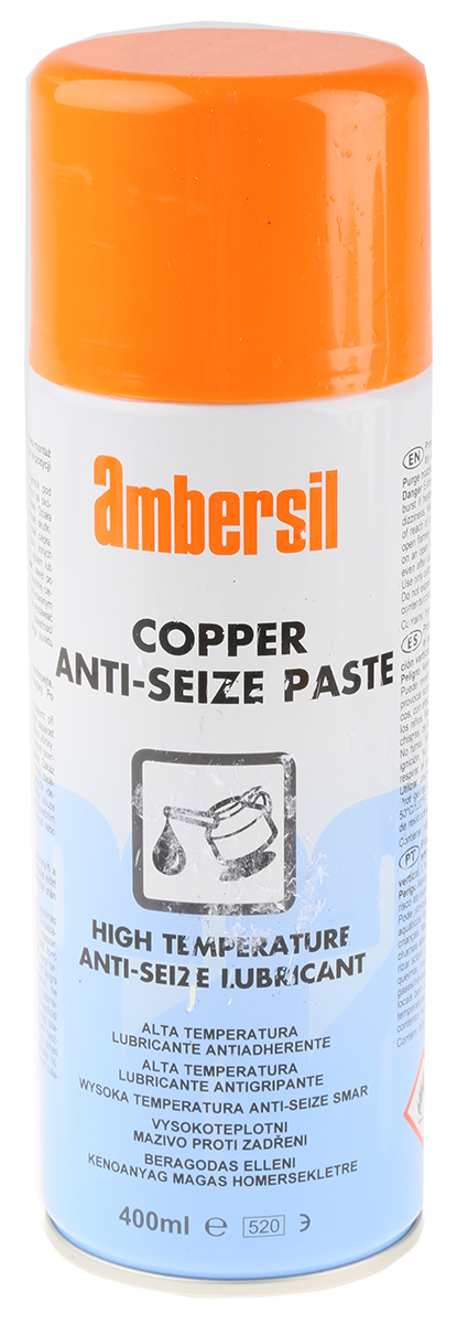 This is Brakes Fasteners Flanges Hydraulics Pipes Seals Spark Plugs Splines Copper Lubricant 400 ml aerosol manufactured by Ambersil. The manufacturer part number is 31642-AA. It is assigned with a trade name of copper anti-seize. The product is food processing safe no . It has a/an copper type lubricant . Applications Information involves brakes, fasteners, flanges, hydraulics, pipes, seals, spark plugs, splines. The package is a sort of aerosol. Its package size is approximately 400 ml . It comes in multipurpose lubricant configuration.