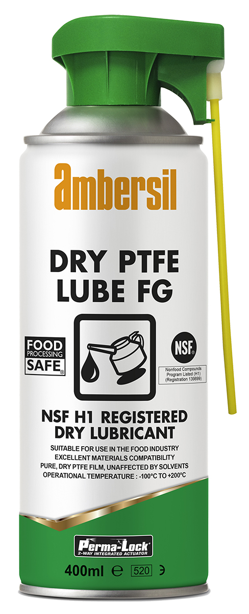 This is Lubricant PTFE 400 ml Perma-Lock FG AerosolFood Safe manufactured by Ambersil. The manufacturer part number is 31589. It is of multi-purpose category . It is assigned with a trade name of perma-lock fg. The product is food processing safe yes . It has a/an ptfe type lubricant . Applications Information involves chute, pin, slides. It features dry ptfe lube fg range. The package is a sort of aerosol. Its package size is approximately 400 ml . It comes in dry lube configuration.
