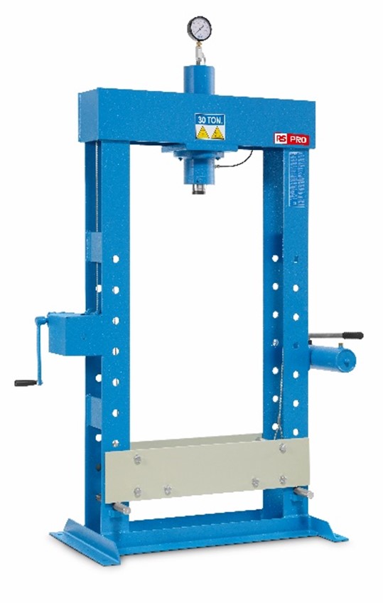 This is 30t Hydraulic Press manufactured by RS PRO. The manufacturer part number is 302-661. Its output pressure is about 30t . The typical product's weight is 280kg. In addition, the height is 2000mm. Furthermore, the product is 1300mm wide. The product comes in 600mm depth. It comes in hydraulic press configuration.