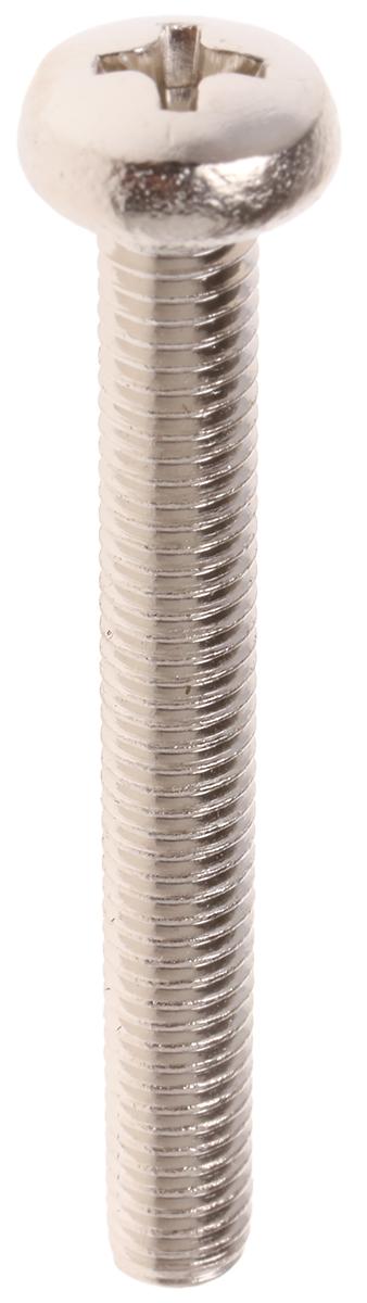 This is Cross Pan Head Machine Screw Brass Nickel Plated M5 x 40mm manufactured by RS Pro. The manufacturer part number is 483-0300. A quality product with a nice nickel plated finish. The product is built with a standard m5 thread size metric . The product complies with all safety standards, such as din 7985. The head has a pan shape. The product features a cross drive. The product is made from highly stable and reliable brass. Furthermore, it has about 40mm metric length . Furthermore, the pitch of the thread is 0.8mm.