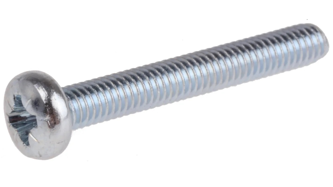 This is Cross Pan Bright Zinc Plated Steel Machine Screw DIN 7985 M4x30mmx1.181in manufactured by RS PRO. The manufacturer part number is 264-6418. A quality product with a nice clear passivated zinc plated finish. The product is built with a standard m4 thread size metric . The product complies with all safety standards, such as din 7985. The head has a pan shape. The product features a pozi drive. The product is made from highly stable and reliable steel. Furthermore, it has about 30mm metric length . Furthermore, the pitch of the thread is 0.7mm.