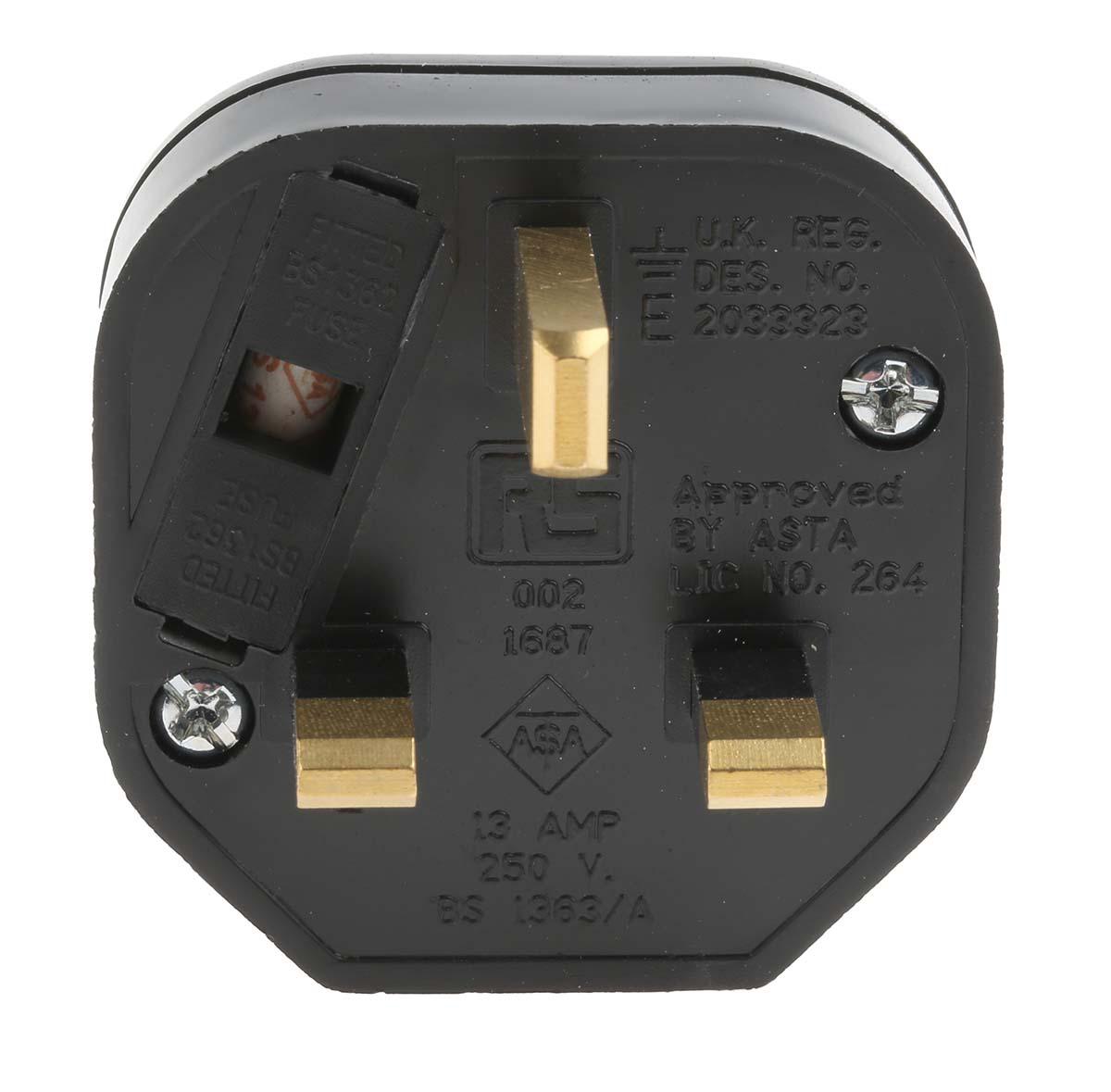 This is UK Mains Connector BS 1363 13A Cable Mount 250 V ac manufactured by RS Pro. The manufacturer part number is 854-396. The product has a current rating of 13a. The product is available in cable mount configuration. Moreover, the product has a nominal 250 v voltage rating. Its main plug is of type g - british bs1363 type . In addition, male is the available "Gender" of the product. It has a decent black colour. While the pole has 2p+e format. The product's body is nicely designed from thermoplastic materials. It comprises a plug. Its country is uk . It has 0 USB sockets .