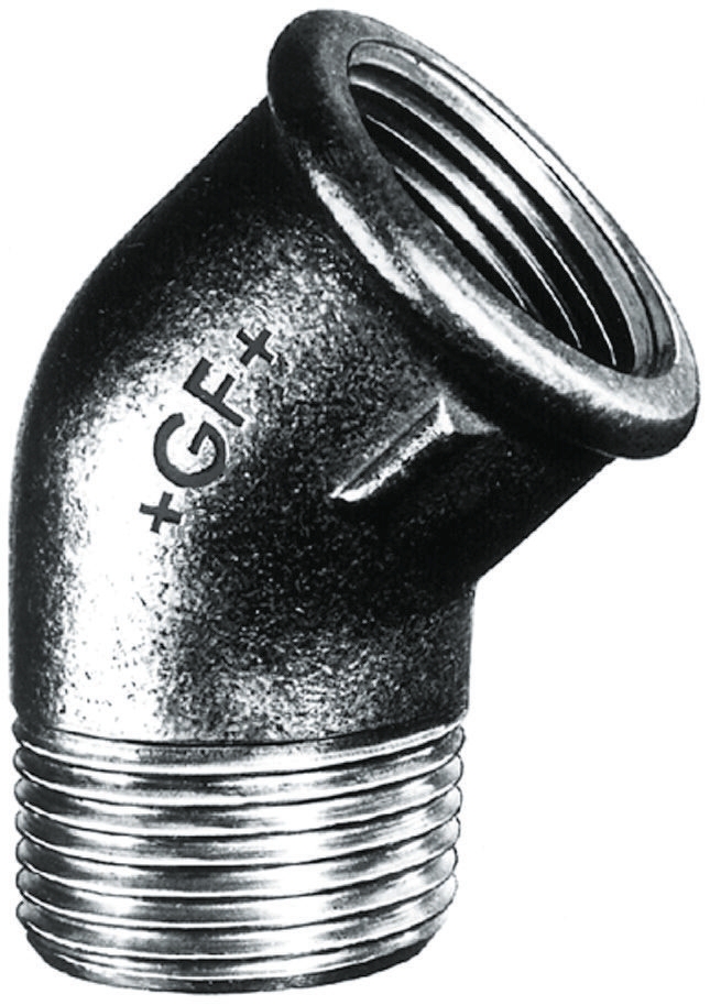 This is Malleable Iron Fitting Elbow 1/2 in BSPT Male (Connection 1) 1/2 in BSPP Female (Connection 2) manufactured by Georg Fischer. The manufacturer part number is 770121104. A quality product with a nice black oxide finish. The fitting direction is 45° . This elbow tool is easy to use with versatile applications in various settings. It has a standard 1/2in thread size 2 . It has a standard 1/2in thread size 1 . In addition, its connection is of female gender 2 . The inner diameter of the product is 9mm. Moreover, its thread is of bspp standard 2 . Its connection 1 is of male gender . In addition, it has a thread of bspt standard 1 .