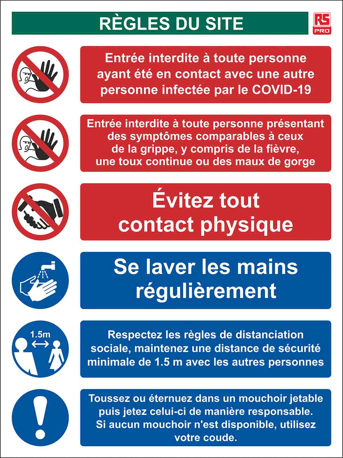 This is PVC Mandatory Site Safety Sign With French Text 400 x 300mm manufactured by RS PRO. The manufacturer part number is 201-3327. Its text message shows covid-19 règles du site . Additionally, it is self-adhesive no . The product is made from highly stable and reliable pvc. In addition, the height is 400 mm. Furthermore, the product is 300mm wide. However, its text language is french . It includes a symbol and text . In addition, it displays site safety sign description .