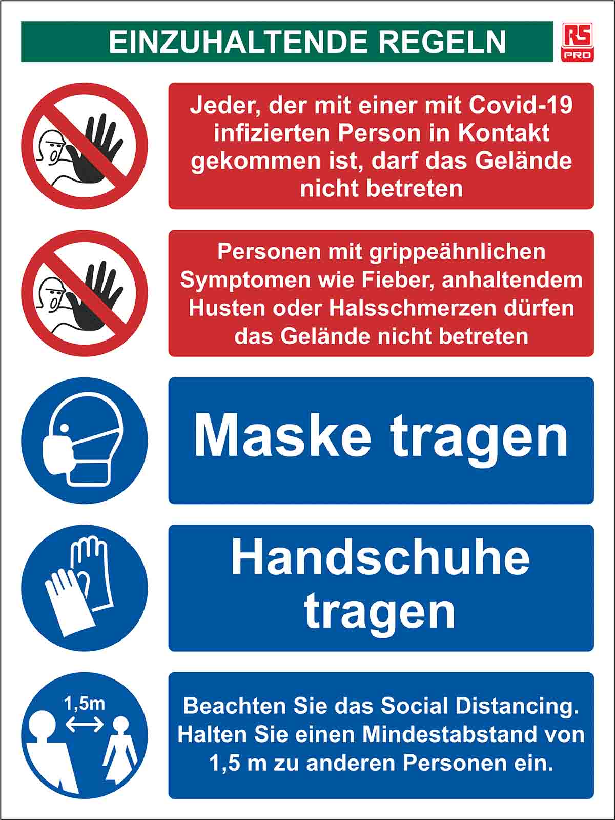 This is PVC Mandatory Workplace Safety Sign With German Text 400 x 300mm manufactured by RS PRO. The manufacturer part number is 201-3336. Its text message shows covid-19 einzuhaltende regeln . Additionally, it is self-adhesive no . The product is made from highly stable and reliable pvc. In addition, the height is 400 mm. Furthermore, the product is 300mm wide. However, its text language is german . It includes a symbol and text . In addition, it displays site safety sign description .