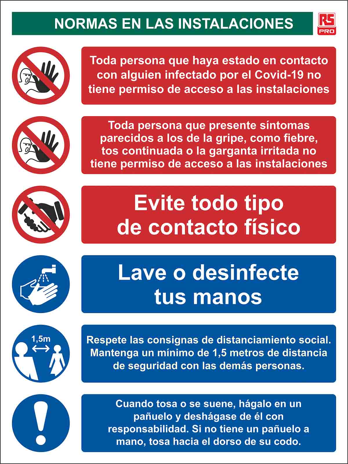 This is PVC Mandatory Site Safety Sign With Spanish Text 400 x 300mm manufactured by RS PRO. The manufacturer part number is 201-3353. Its text message shows covid-19 normas de las instalaciones . Additionally, it is self-adhesive no . The product is made from highly stable and reliable pvc. In addition, the height is 400 mm. Furthermore, the product is 300mm wide. However, its text language is spanish . It includes a symbol and text . In addition, it displays site safety sign description .
