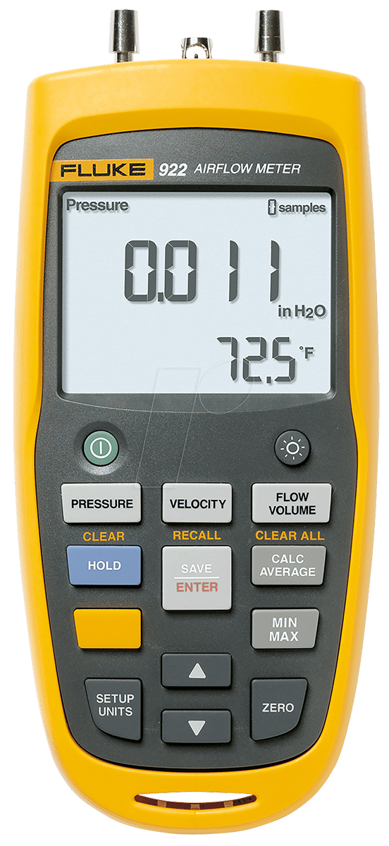 The Fluke 922/KIT is a versatile meter designed for HVAC, building services, and industrial ventilation professionals who need to measure airflow, differential pressure, and velocity with precision. With a differential pressure range of ±40 mbar (resolution 0.01 mbar, accuracy ±1 % + 0.01 mbar) and dedicated airflow/velocity functions, the 922/KIT enables duct traversals, filter performance checks, and ventilation balancing in a single rugged instrument. It comes as a kit, complete with hoses, Pitot tube, ToolPak magnetic strip, carrying case, and batteries.