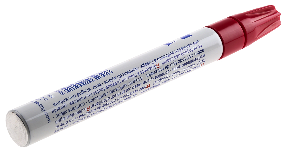 This is Fine Tip Red Permanent Marker manufactured by Edding. The manufacturer part number is 8300-002. The tip is designed with a bullet shape. The tip is fine in size. Its ink colour is red . In addition, it has a/an permanent marker type marker .