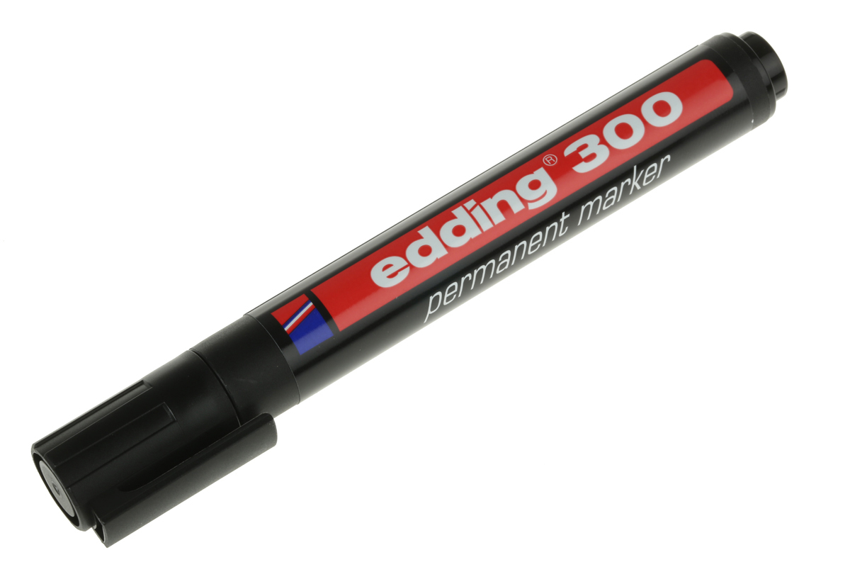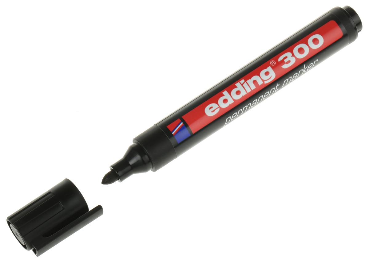 This is Fine Tip Black Permanent Marker manufactured by Edding. The manufacturer part number is 300-001. The tip is designed with a bullet shape. The tip is fine in size. Its ink colour is black . In addition, it has a/an permanent marker type marker .