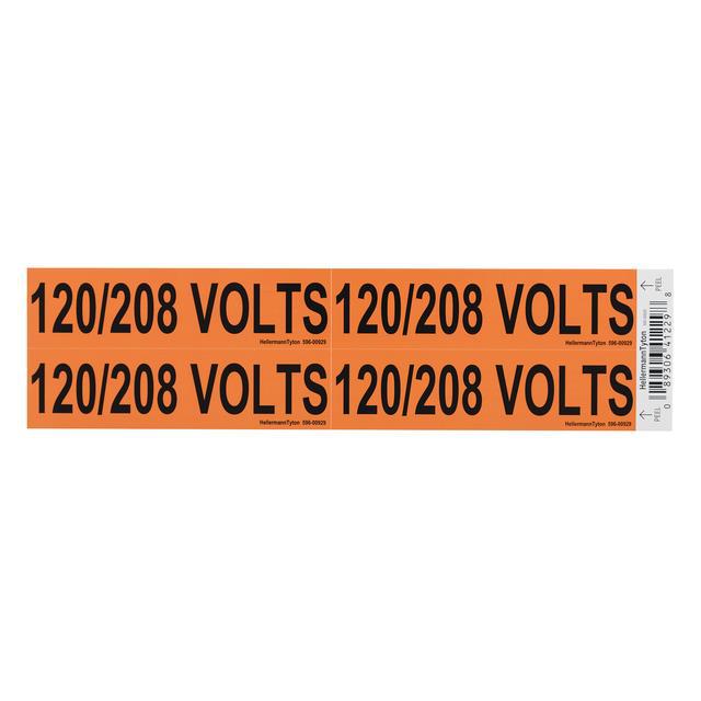 This is manufactured by HellermannTyton. The manufacturer part number is 596-00929. It is assigned with possible HTSUS value of 3919.10.2055. It is shipped in bulk package . It has a classic orange, black colour. The product is made from highly stable and reliable vinyl. Its typical moisture sensitivity level is not applicable. The product has -40°c ~ 80°c operating temperature range. It has a long 4 weeks standard lead time. The product is designated with the ear99 code number. It comes in wire marker, adhesive configuration. Legend Information: 120/208 volts. Moreover, it corresponds to 596-00, a base product number of the product. The product is available in 4.25" w x 1.13" l (108.0mm x 28.6mm) size.