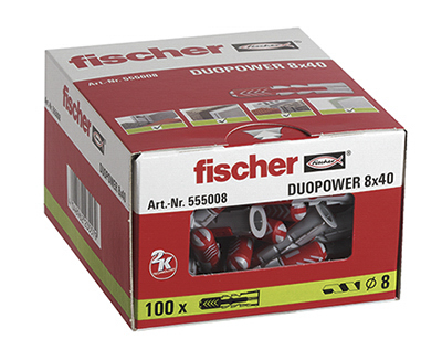 This is Duopower 8 x 40mm (without screws) manufactured by Fischer Fixings. The manufacturer part number is 555008. The product duopower, is a highly preferred choice for users. The product is made from highly stable and reliable nylon. The diameter of the fixing hole is 8mm. Its accurate length is 40mm. In addition, it has a maximum 15mm fixing thickness . It comes in dowel configuration.