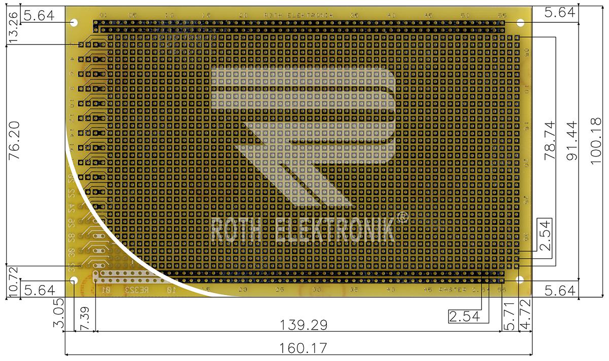 This is Single Sided DIN 41612 D/E/F Matrix Board FR4 with 32 x 55 1mm Holes 2.54 x 2.54mm Pitch 160 x 100 x 1.5mm manufactured by Roth Elektronik. The manufacturer part number is RE323-LF. It has a 32 x 55 layout hole . Its copper thickness is about 35µm . The given dimensions of the product include 160 x 100 x 1.5mm. It has a standard din 41612 d, din 41612 e, din 41612 f connection . Its hole pitch is about 2.54 x 2.54mm . It is 1.5mm thick. Furthermore, the product is 100mm wide. Its accurate length is 160mm. Moreover, its FR material is of fr4 grade . Has a hole diameter of 1mm. Its base is made up of epoxy glass fabric laminate material . Additionally, it is/has 1 sides .