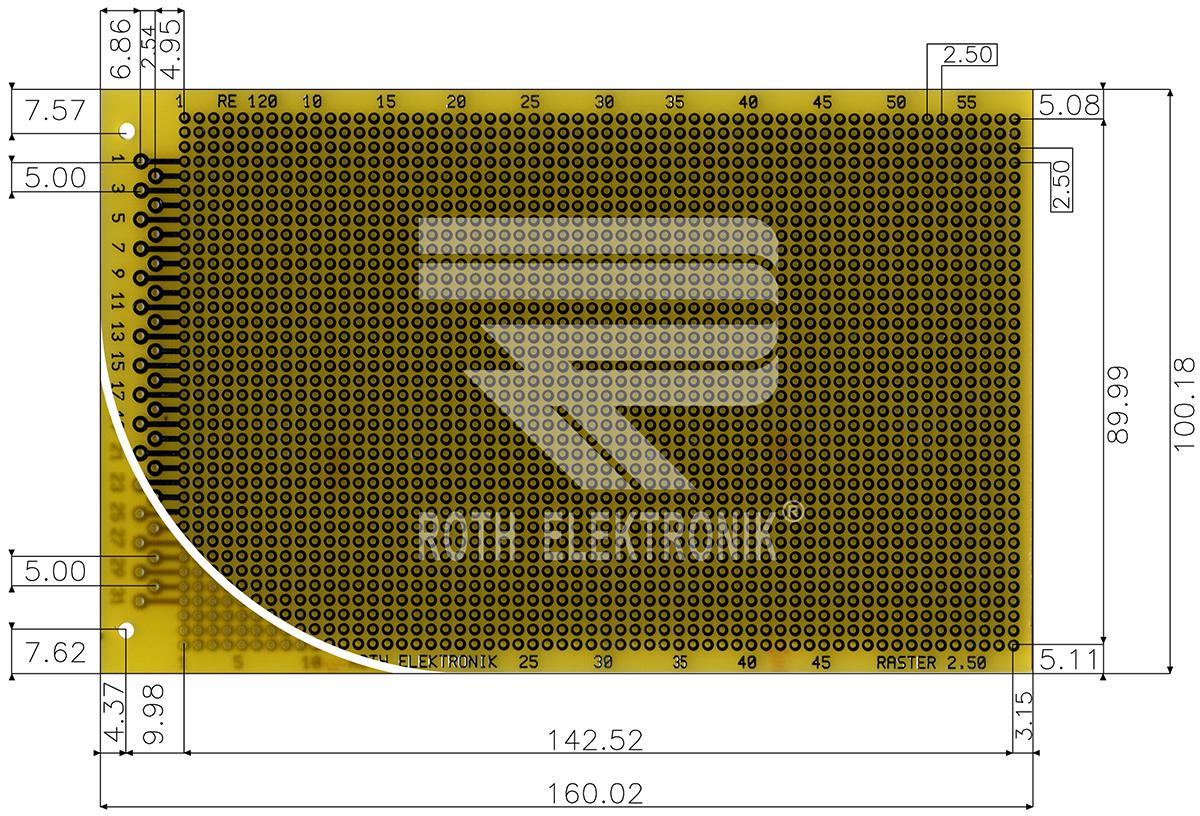 This is Single Sided DIN 41617 Photoresist Board FR4 with 37 x 58 1mm Holes 2.5 x 2.5mm Pitch 160 x 100 x 1.5mm manufactured by Roth Elektronik. The manufacturer part number is RE120-LF. It has a 37 x 58 layout hole . Its copper thickness is about 35µm . The given dimensions of the product include 160 x 100 x 1.5mm. It has a standard din 41617 connection . Its hole pitch is about 2.5 x 2.5mm . It is 1.5mm thick. Furthermore, the product is 100mm wide. Its accurate length is 160mm. Moreover, its FR material is of fr4 grade . Has a hole diameter of 1mm. Its base is made up of epoxy glass fabric laminate material . Additionally, it is/has 1 sides .