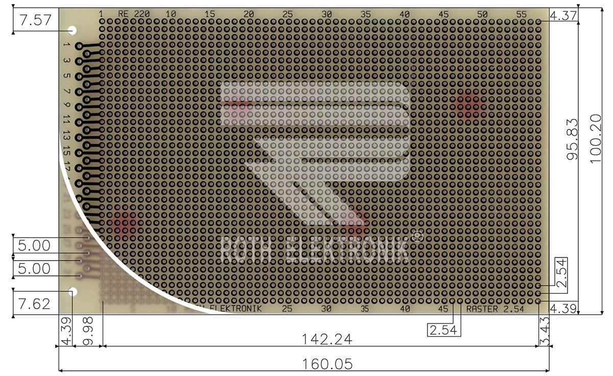 This is Single Sided DIN 41617 Matrix Board FR4 with 37 x 58 1mm Holes 2.54 x 2.54mm Pitch 160 x 100 x 1.5mm manufactured by Roth Elektronik. The manufacturer part number is RE220-LF. It has a 37 x 58 layout hole . Its copper thickness is about 35µm . The given dimensions of the product include 160 x 100 x 1.5mm. It has a standard din 41617 connection . Its hole pitch is about 2.54 x 2.54mm . It is 1.5mm thick. Furthermore, the product is 100mm wide. Its accurate length is 160mm. Moreover, its FR material is of fr4 grade . Has a hole diameter of 1mm. Its base is made up of epoxy glass fabric laminate material . Additionally, it is/has 1 sides .