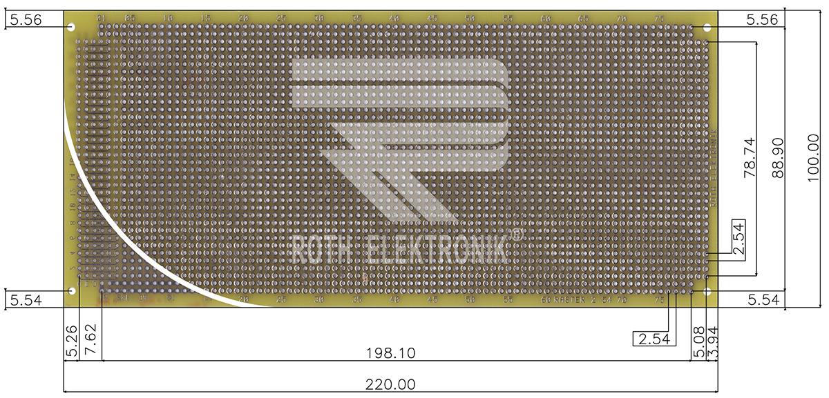 This is Double Sided DIN 41612 Multibus II Board with 32 x 81 1mm Holes 2.54 x 2.54mm Pitch 220 x 100 x 1.5mm manufactured by Roth Elektronik. The manufacturer part number is RE332-LF. It has a 32 x 81 layout hole . Its copper thickness is about 35µm . The given dimensions of the product include 220 x 100 x 1.5mm. It has a standard din 41612 connection . Its hole pitch is about 2.54 x 2.54mm . It is 1.5mm thick. Furthermore, the product is 100mm wide. Its accurate length is 220mm. Has a hole diameter of 1mm. Its base is made up of epoxy glass fabric laminate material . Additionally, it is/has 2 sides .