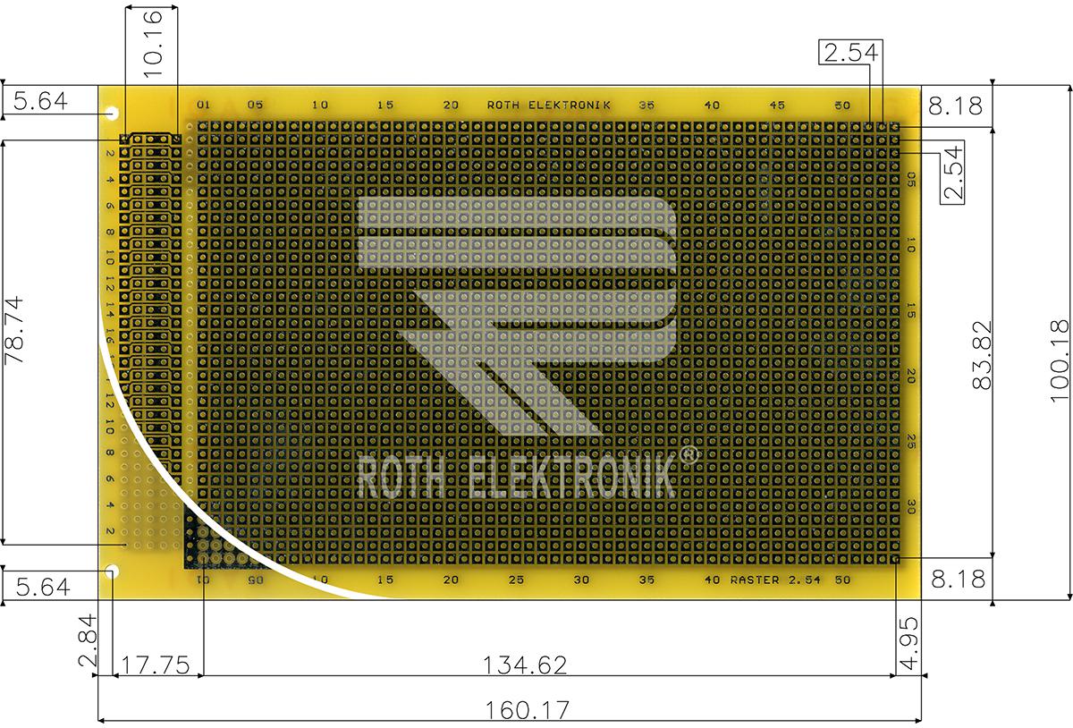 This is Double Sided Matrix Board FR4 with 34 x 54 1mm Holes 2.54 x 2.54mm Pitch 160 x 100 x 1.5mm manufactured by Roth Elektronik. The manufacturer part number is RE201-LFDS. It has a 34 x 54 layout hole . Its copper thickness is about 35µm . The given dimensions of the product include 160 x 100 x 1.5mm. Its hole pitch is about 2.54 x 2.54mm . It is 1.5mm thick. Furthermore, the product is 100mm wide. Its accurate length is 160mm. Moreover, its FR material is of fr4 grade . Has a hole diameter of 1mm. Its base is made up of epoxy glass fabric laminate material . Additionally, it is/has 2 sides .