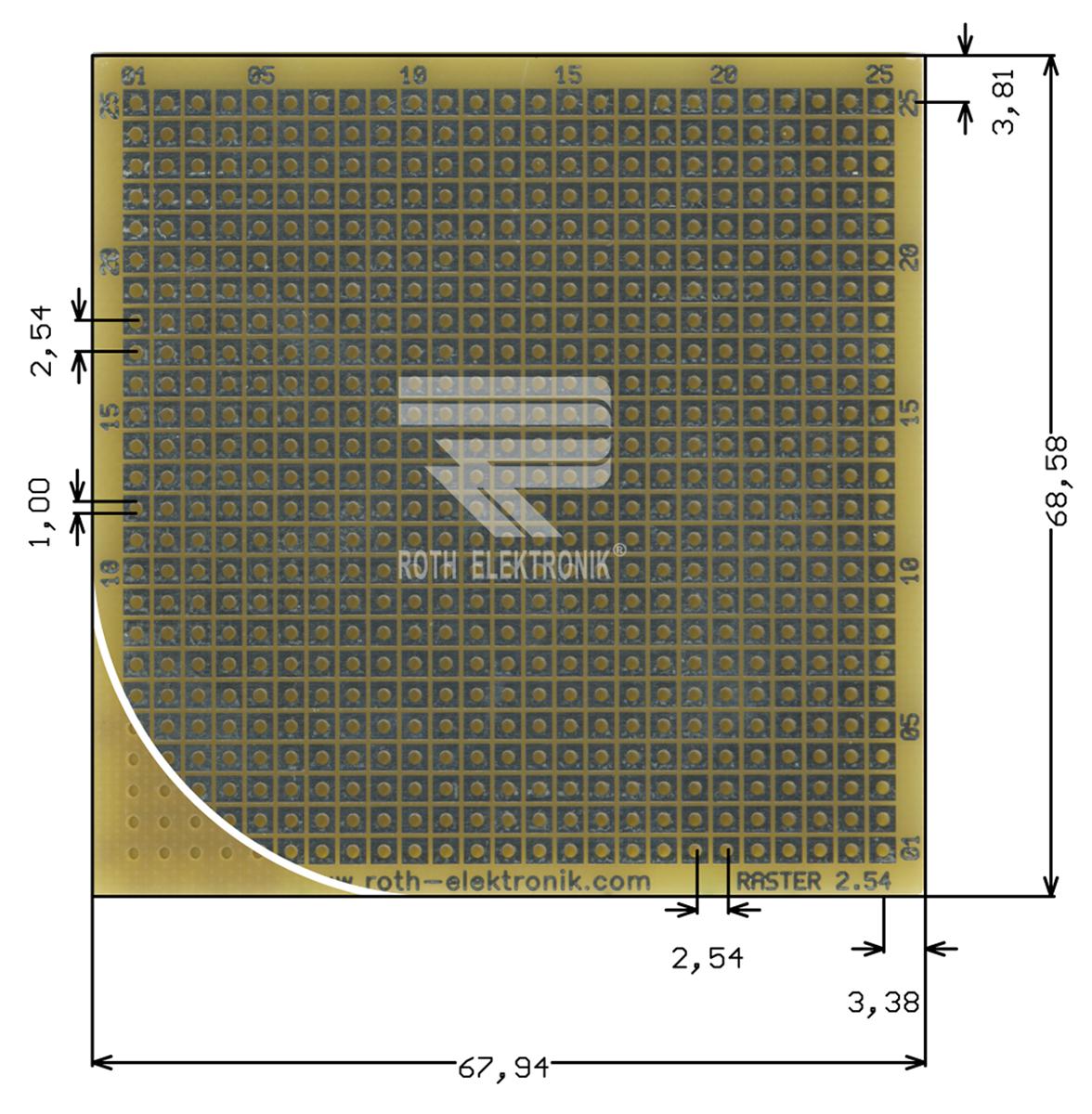 This is Single Sided Matrix Board FR4 with 25 x 25 1mm Holes 2.54 x 2.54mm Pitch 68.58 x 67.94 x 1.5mm manufactured by Roth Elektronik. The manufacturer part number is RE016-LF. It has a 25 x 25 layout hole . Its copper thickness is about 35µm . The given dimensions of the product include 68.58 x 67.94 x 1.5mm. Its hole pitch is about 2.54 x 2.54mm . It is 1.5mm thick. Furthermore, the product is 67.94mm wide. Its accurate length is 68.58mm. Moreover, its FR material is of fr4 grade . The circuit has one side pattern. Has a hole diameter of 1mm. Its base is made up of epoxy fibre-glass material . Additionally, it is/has 1 sides .