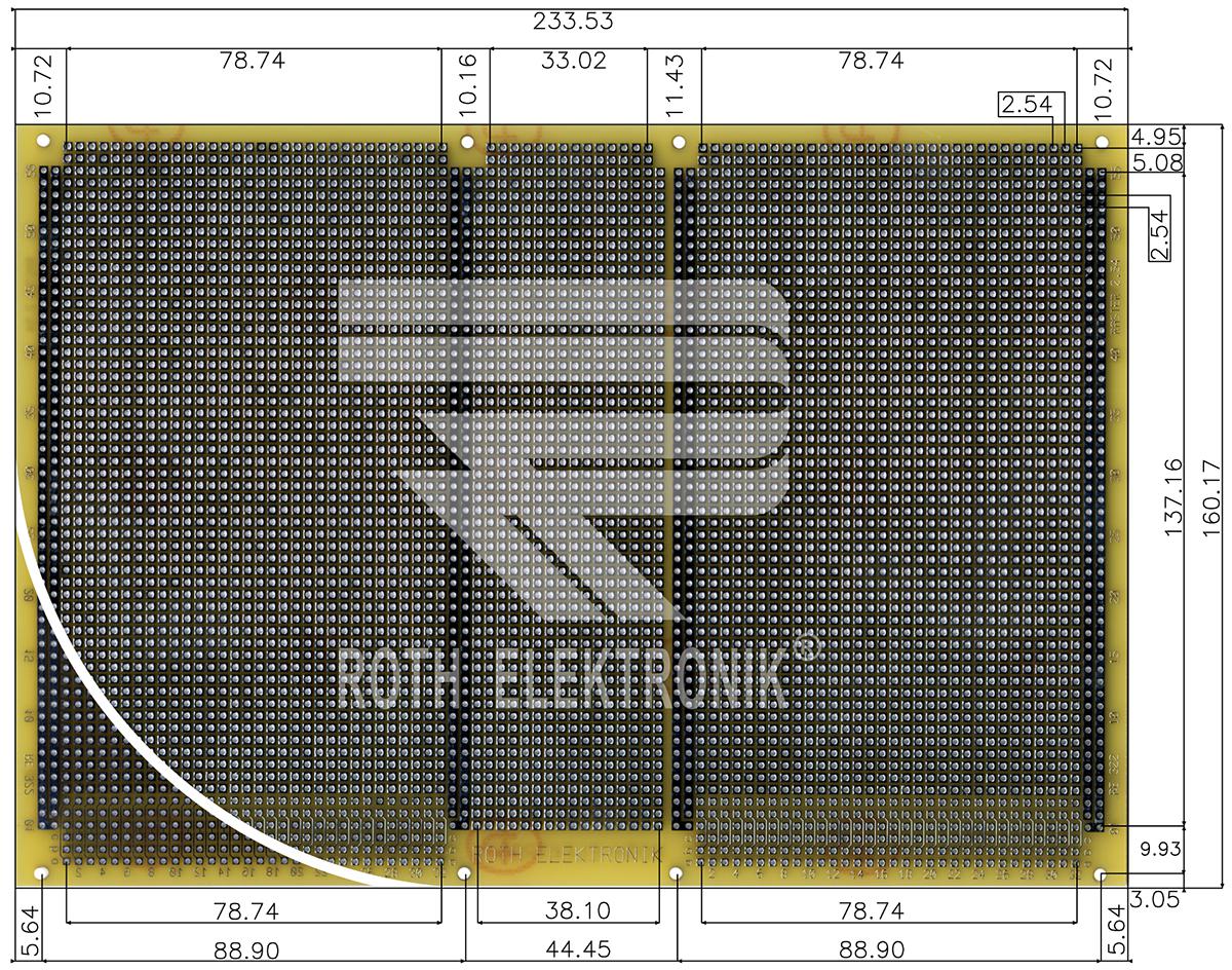 This is Double Sided DIN 41612 C Matrix Board FR4 with 55 x 88 1mm Holes 2.54 x 2.54mm Pitch 233.4 x 160 x 1.5mm manufactured by Roth Elektronik. The manufacturer part number is RE322-LF. It has a 55 x 88 layout hole . Its copper thickness is about 35µm . The given dimensions of the product include 233.4 x 160 x 1.5mm. It has a standard din 41612 c connection . Its hole pitch is about 2.54 x 2.54mm . It is 1.5mm thick. Furthermore, the product is 160mm wide. Its accurate length is 233.4mm. Moreover, its FR material is of fr4 grade . Has a hole diameter of 1mm. Its base is made up of epoxy glass fabric laminate material . Additionally, it is/has 2 sides .