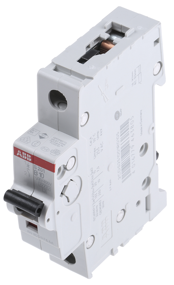 This is System M Pro S200 MCB Mini Circuit Breaker 1P 10 A 6 kA Curve B manufactured by ABB. The manufacturer part number is 2CDS251001R0105 - S201B10. The product has a current rating of 10a. Furthermore, the product is 17.5mm wide. It utilises thermal tripping mechanism. The product s200, is a highly preferred choice for users. This is a type of mcb, a circuit breaker with unique features. Its accurate length is 88mm. It has a model number s201b10. The product has a rated DC voltage of 72v. The product is available in din rail mount style. Applications Information involves commercial, residential. The product comes in 69mm depth. The product has a rated AC voltage of 253v. The product has 6 ka breaking capacity at maximum voltage rating. It features system pro m compact range. The terminal contact is kind of screw. It allows type b tripping features. It has equipped with 1 poles.