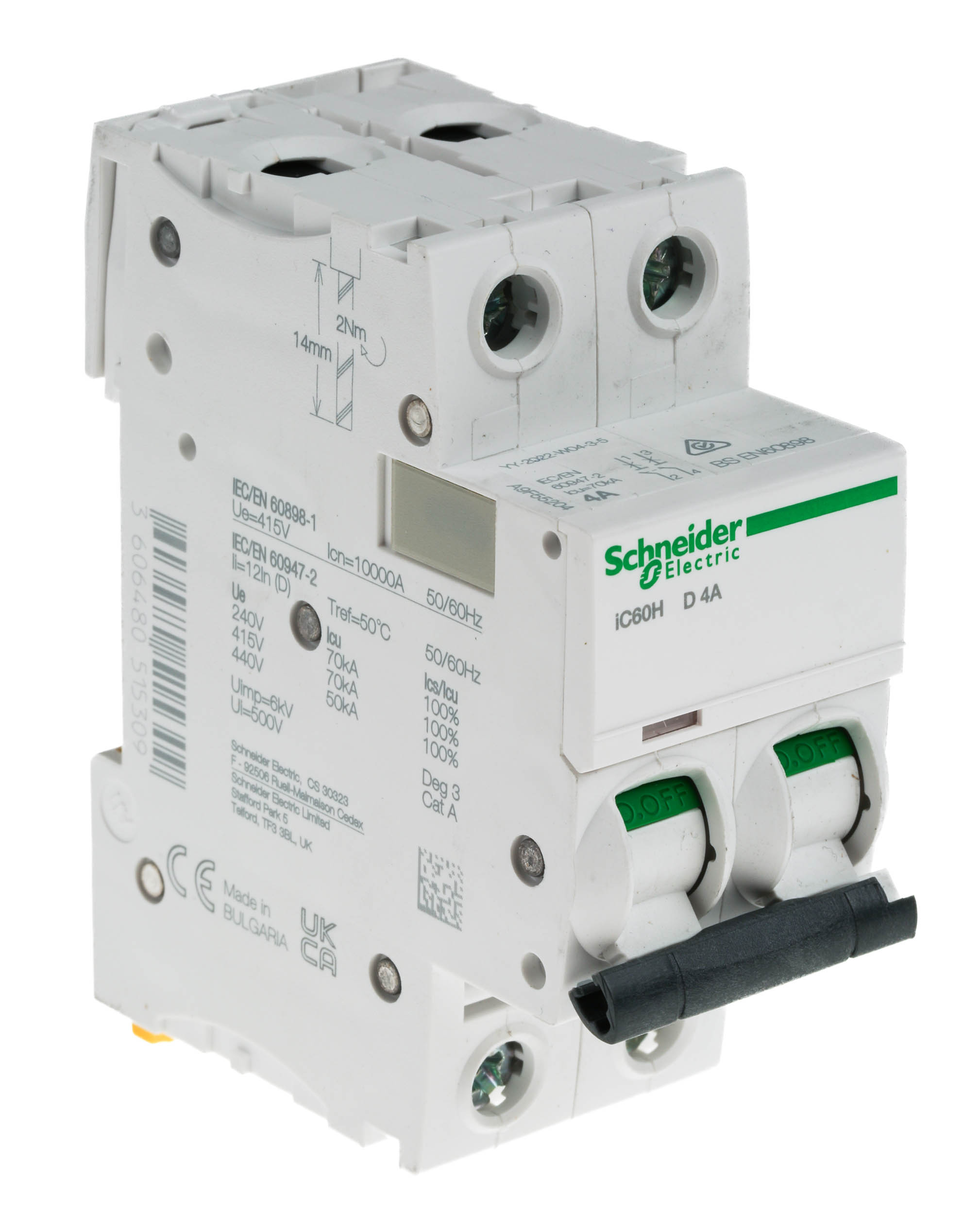 This is Acti 9 iC60H MCB Mini Circuit Breaker 2P 4 A 10 KA Curve D manufactured by Schneider Electric. The manufacturer part number is A9F55204. Better World Verification Options - green premium. Is it a better world product? yes. The product has a current rating of 4a. This is a type of mcb, a circuit breaker with unique features. It utilises thermal-magnetic tripping mechanism. The product ic60h, is a highly preferred choice for users. Its accurate length is 85mm. The product has 10 ka breaking capacity at maximum voltage rating. The product has a rated DC voltage of 100 → 133v. The product is available in din rail mount style. Furthermore, the product is 36mm wide. The product comes in 78.5mm depth. The product has a rated AC voltage of 440 v, 12 → 133 v, 220 → 240 v, 380 → 415v. It features acti 9 range. The terminal contact is kind of screw. It allows type d tripping features. It has equipped with 2 poles. It is a rocker switch reset actuator.