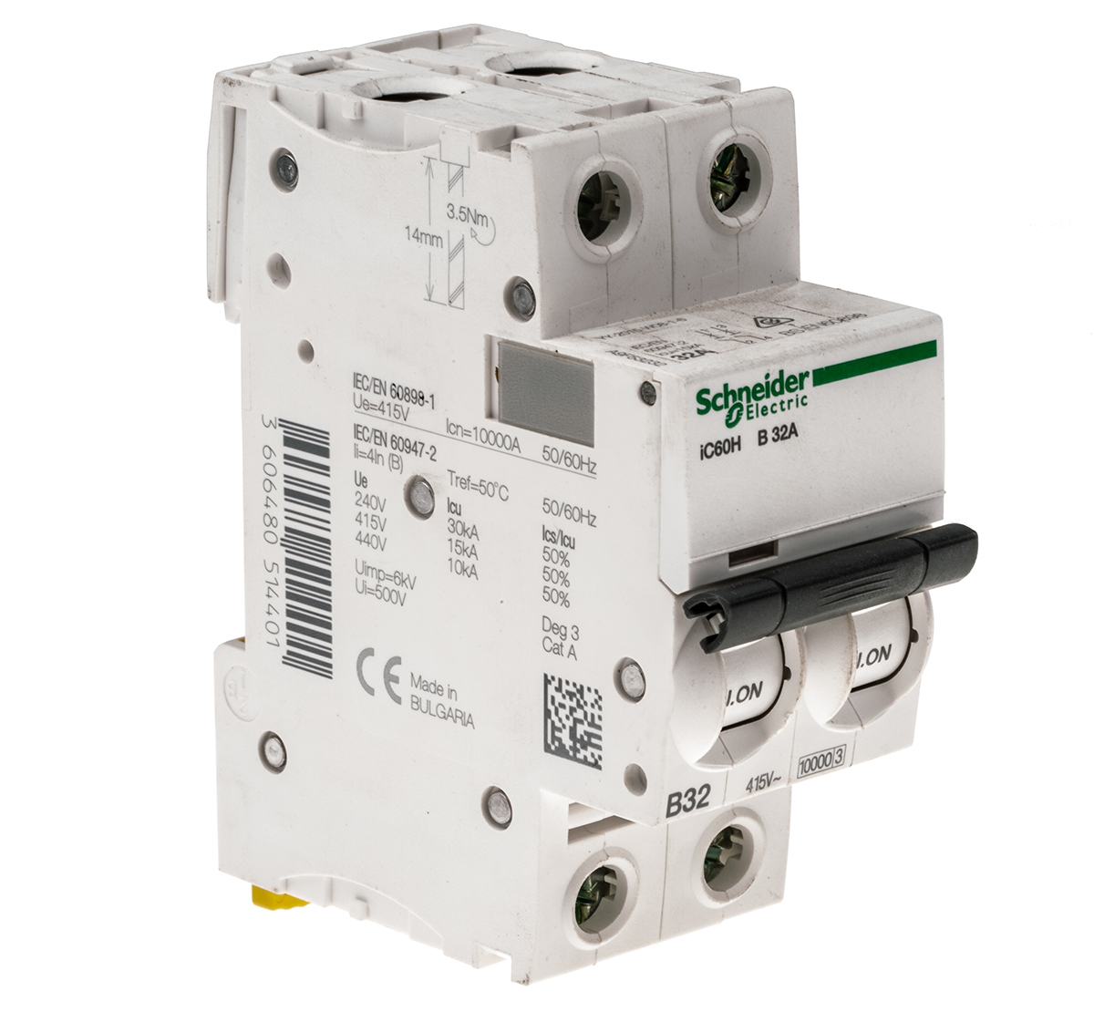 This is Acti 9 iC60H MCB Mini Circuit Breaker 2P 32 A 10 KA Curve B manufactured by Schneider Electric. The manufacturer part number is A9F53232. Better World Verification Options - green premium. Is it a better world product? yes. The product has a current rating of 32a. This is a type of mcb, a circuit breaker with unique features. It utilises thermal-magnetic tripping mechanism. The product ic60h, is a highly preferred choice for users. Its accurate length is 85mm. The product has 10 ka breaking capacity at maximum voltage rating. The product has a rated DC voltage of 100 → 133v. The product is available in din rail mount style. Furthermore, the product is 36mm wide. The product comes in 78.5mm depth. The product has a rated AC voltage of 440 v, 12 → 133 v, 220 → 240 v, 380 → 415v. It features acti 9 range. The terminal contact is kind of screw. It allows type b tripping features. It has equipped with 2 poles. It is a rocker switch reset actuator.