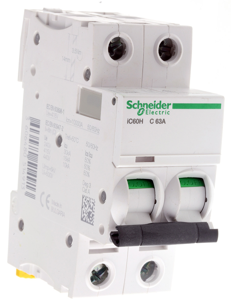 This is Acti 9 iC60H MCB Mini Circuit Breaker 2P 63 A 10 KA Curve C manufactured by Schneider Electric. The manufacturer part number is A9F54263. Better World Verification Options - green premium. Is it a better world product? yes. The product has a current rating of 63a. This is a type of mcb, a circuit breaker with unique features. It utilises thermal-magnetic tripping mechanism. The product ic60h, is a highly preferred choice for users. Its accurate length is 85mm. The product has 10 ka breaking capacity at maximum voltage rating. The product has a rated DC voltage of 100 → 133v. The product is available in din rail mount style. Furthermore, the product is 36mm wide. The product comes in 78.5mm depth. The product has a rated AC voltage of 440 v, 12 → 133 v, 220 → 240 v, 380 → 415v. It features acti 9 range. The terminal contact is kind of screw. It allows type c tripping features. It has equipped with 2 poles. It is a rocker switch reset actuator.
