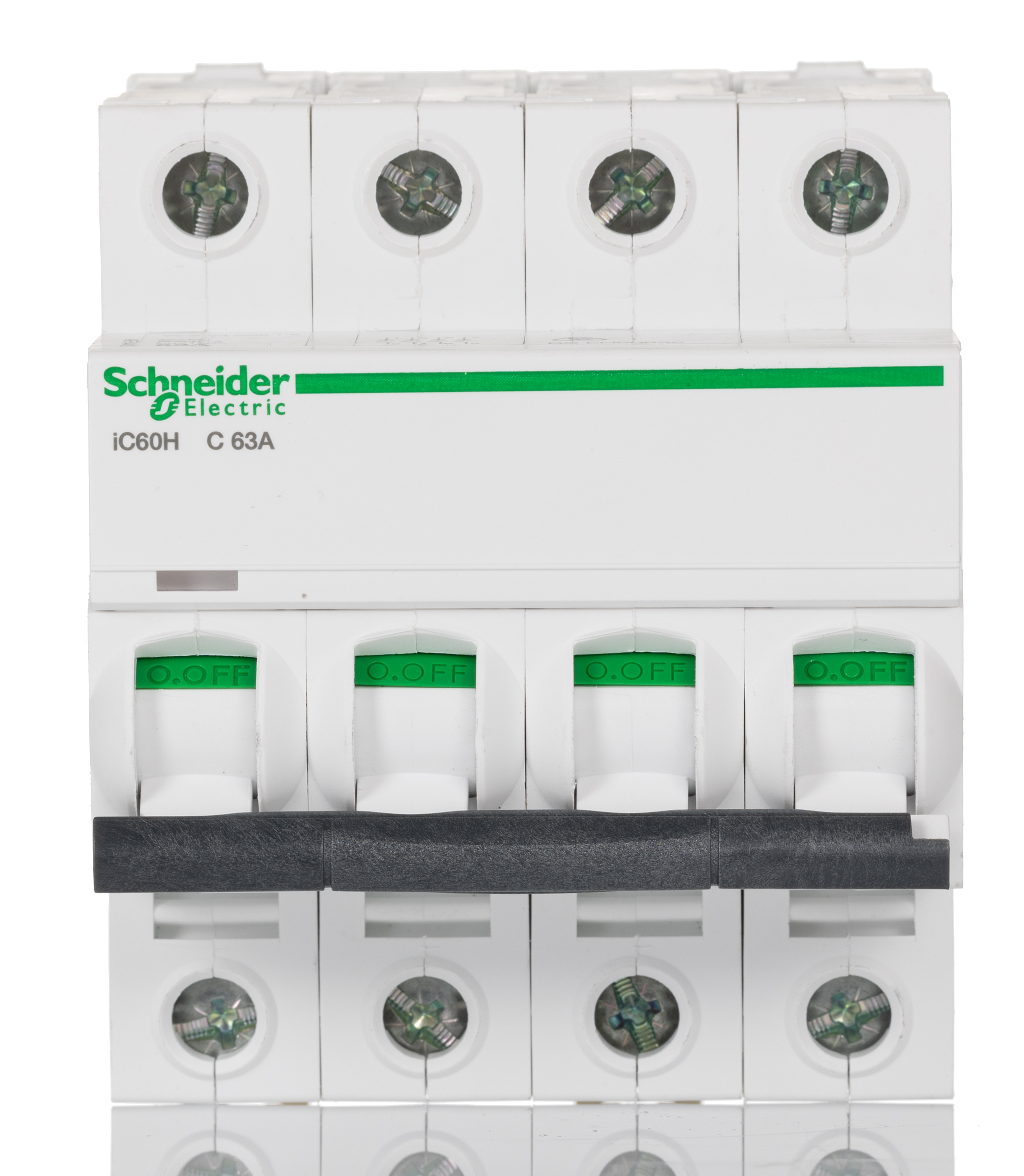 This is Acti 9 iC60H MCB Mini Circuit Breaker 4P 63 A 10 KA Curve C manufactured by Schneider Electric. The manufacturer part number is A9F54463. Better World Verification Options - green premium. Is it a better world product? yes. The product has a current rating of 63a. This is a type of mcb, a circuit breaker with unique features. It utilises thermal-magnetic tripping mechanism. The product ic60h, is a highly preferred choice for users. Its accurate length is 85mm. The product has 10 ka breaking capacity at maximum voltage rating. The product has a rated DC voltage of 220 → 250v. The product is available in din rail mount style. Furthermore, the product is 72mm wide. The product comes in 78.5mm depth. The product has a rated AC voltage of 440 v, 12 → 133 v, 220 → 240 v, 380 → 415v. It features acti 9 range. The terminal contact is kind of screw. It allows type c tripping features. It has equipped with 4 poles. It is a rocker switch reset actuator.