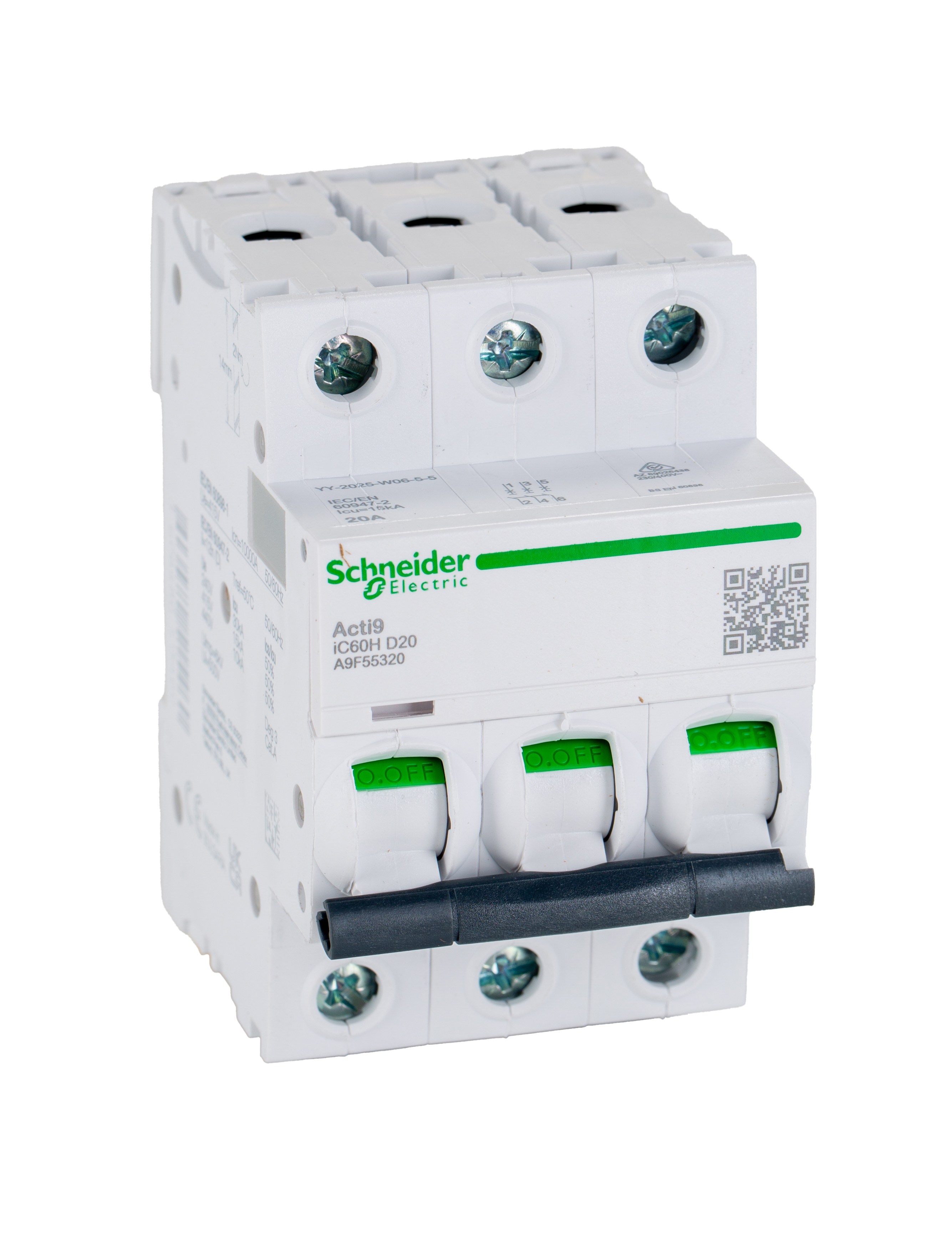 This is Acti 9 iC60H MCB Mini Circuit Breaker 3P 20 A 10 KA Curve D manufactured by Schneider Electric. The manufacturer part number is A9F55320. Better World Verification Options - green premium. Is it a better world product? yes. The product has a current rating of 20a. This is a type of mcb, a circuit breaker with unique features. It utilises thermal-magnetic tripping mechanism. The product ic60h, is a highly preferred choice for users. Its accurate length is 85mm. The product has 10 ka breaking capacity at maximum voltage rating. The product has a rated DC voltage of 100 → 133v. The product is available in din rail mount style. Furthermore, the product is 54mm wide. The product comes in 78.5mm depth. The product has a rated AC voltage of 440 v, 12 → 133 v, 220 → 240 v, 380 → 415v. It features acti 9 range. The terminal contact is kind of screw. It allows type d tripping features. It has equipped with 3 poles. It is a rocker switch reset actuator.