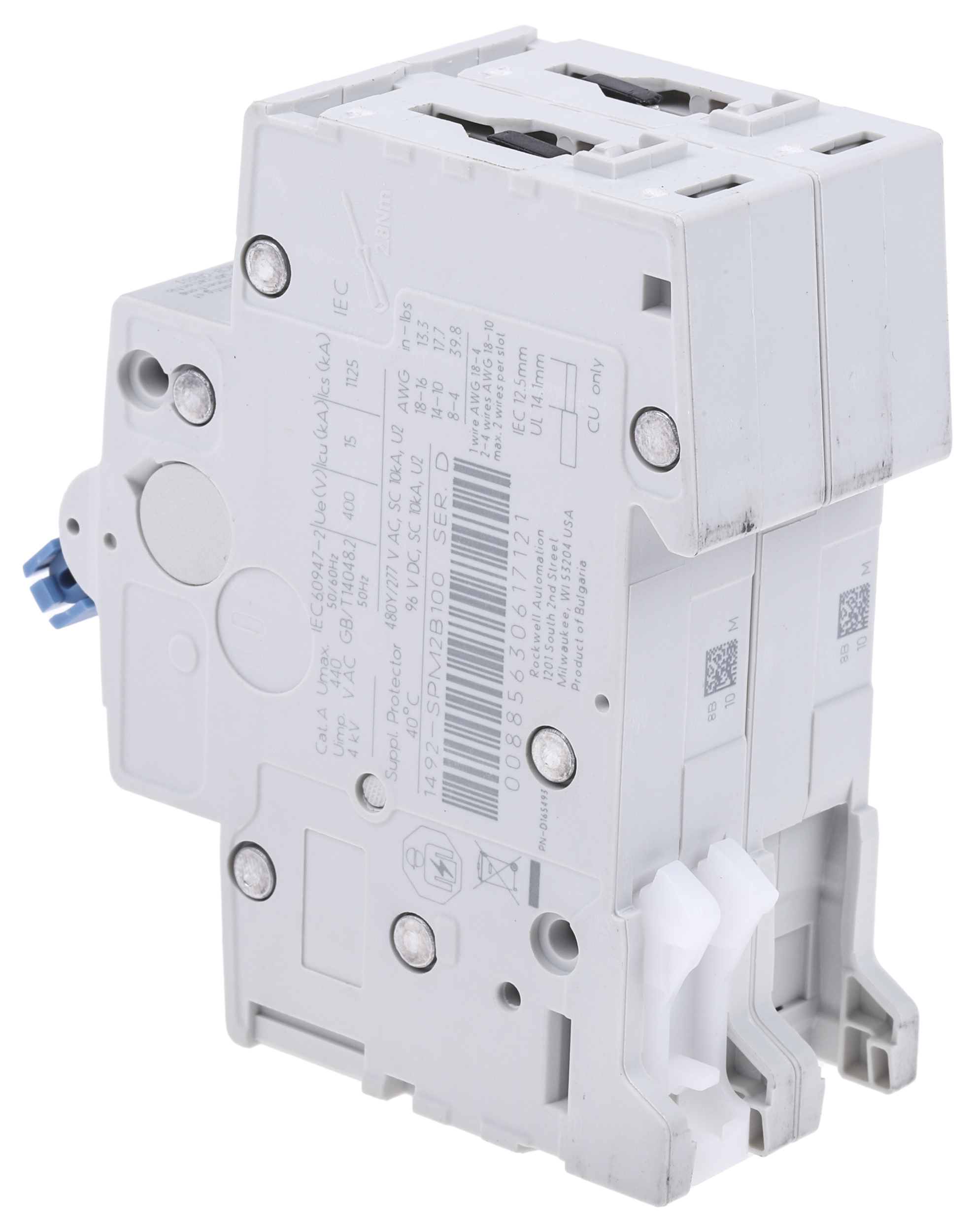 This is 1492 1492SPM MCB Mini Circuit Breaker 2P 10 A 10 kA Curve B manufactured by Allen Bradley. The manufacturer part number is 1492-SPM2B100. The product has a current rating of 10a. Applications Information involves general purpose. It utilises thermal-magnetic tripping mechanism. The product 1492-spm, is a highly preferred choice for users. This is a type of mcb, a circuit breaker with unique features. Its accurate length is 35mm. The product has 10 ka breaking capacity at maximum voltage rating. The product has a rated DC voltage of 96v. The product is available in din rail mount style. Furthermore, the product is 75mm wide. The product comes in 88mm depth. The product has a rated AC voltage of 277 v, 480v. It has a/an instantaneous break time . It features 1492 range. The terminal contact is kind of screw. It allows type b tripping features. It has equipped with 2 poles. It is a toggle switch reset actuator.