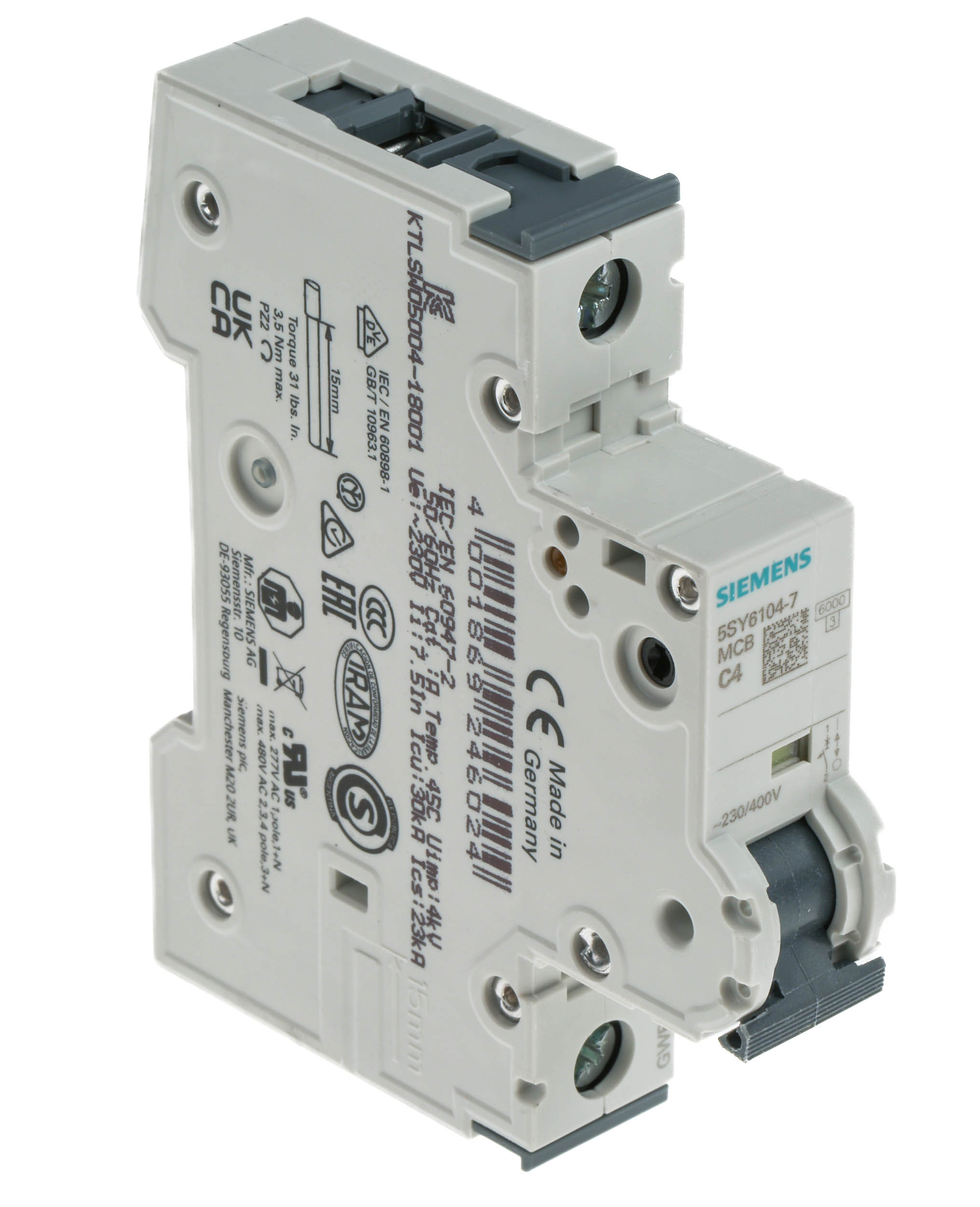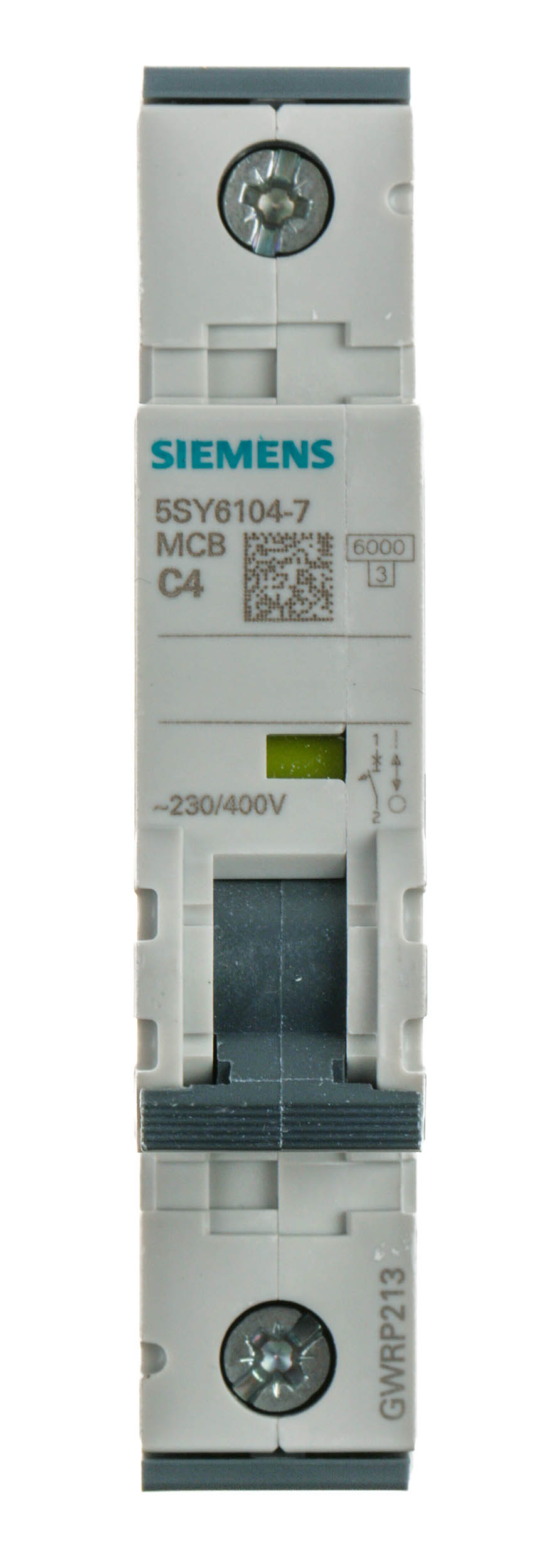 This is Sentron 5SY6 MCB Mini Circuit Breaker 1P 4 A 6 kA Curve C manufactured by Siemens. The manufacturer part number is 5SY6104-7. Is it a better world product? yes. The product has a current rating of 4a. Applications Information involves industrial appliances, power supplies, power tools. The product 5sy6, is a highly preferred choice for users. This is a type of mcb, a circuit breaker with unique features. Its accurate length is 89.8mm. The product has 6 ka breaking capacity at maximum voltage rating. The product has a rated DC voltage of 72v. The product is available in din rail mount style. Furthermore, the product is 17.5mm wide. The product comes in 76mm depth. The product has a rated AC voltage of 230 v, 400v. It features sentron range. It allows type c tripping features. It has equipped with 1 poles.