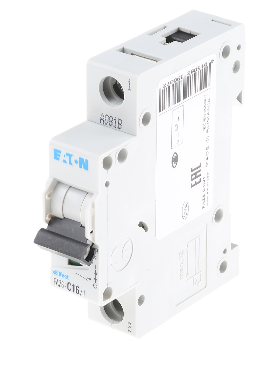 This is xEffect 16A MCB Mini Circuit Breaker1P Curve C Breaking Capacity 6 kA 230 → 400V manufactured by Eaton. The manufacturer part number is 239037 FAZ6-C16/1. The product has a current rating of 16a. This is a type of mcb, a circuit breaker with unique features. It utilises thermal-magnetic tripping mechanism. Its accurate length is 80mm. The product has 6 ka breaking capacity at maximum voltage rating. It allows type c tripping features. The product is available in din rail mount style. Furthermore, the product is 17.5mm wide. The product comes in 62mm depth. The product has a rated AC voltage of 230 → 400v. It has a/an instantaneous break time . It features xeffect range. The terminal contact is kind of screw. It has equipped with 1p poles. It is a toggle switch reset actuator.
