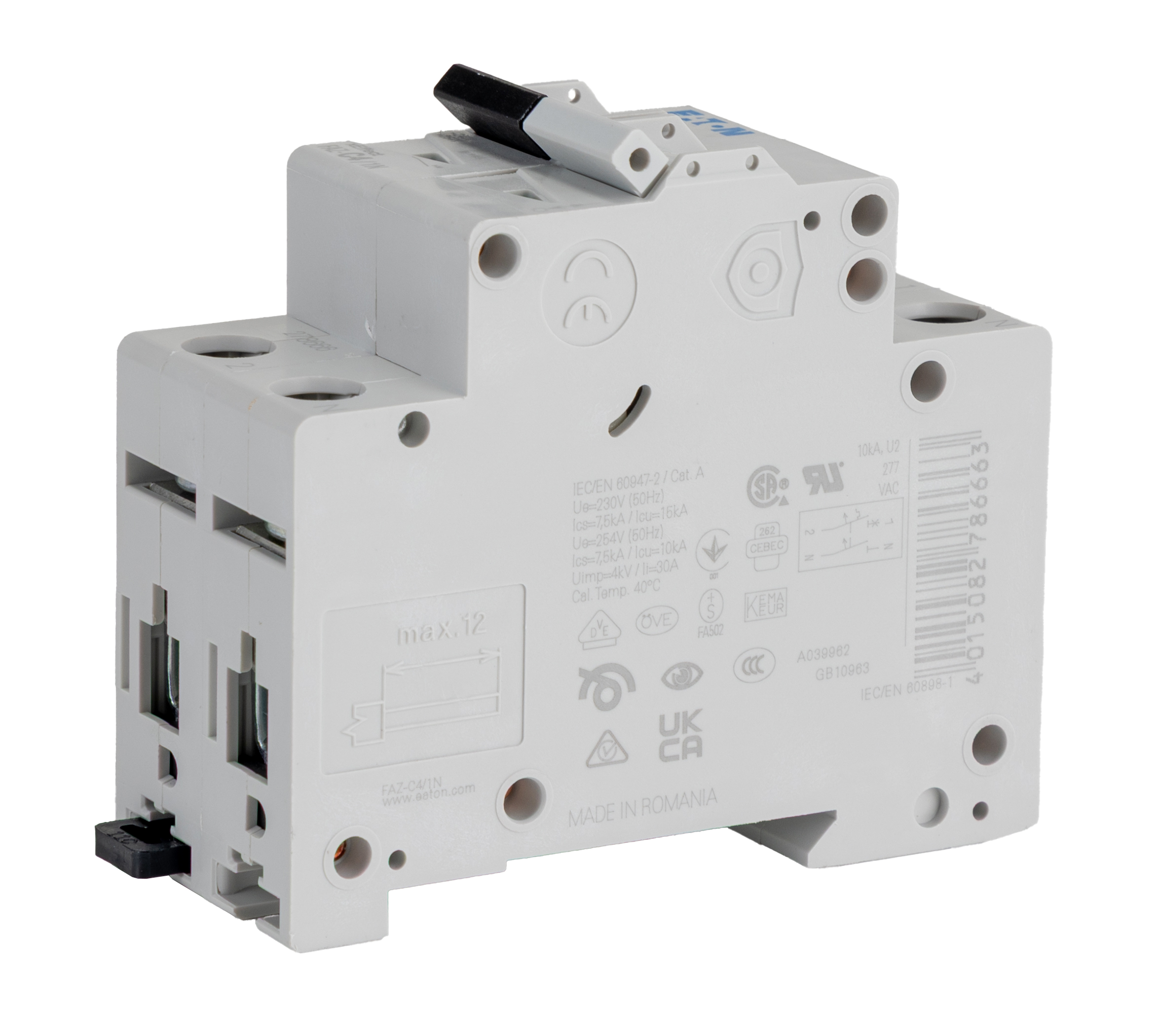 This is xEffect 4A MCB Mini Circuit Breaker Curve C Breaking Capacity 10 kA 240V manufactured by Eaton. The manufacturer part number is 278666 FAZ-C4/1N. The product has 10 ka breaking capacity at maximum voltage rating. The product has a current rating of 4a. Applications Information involves advanced commercial and industrial. It utilises thermal-magnetic tripping mechanism. This is a type of mcb, a circuit breaker with unique features. Its accurate length is 17.8mm. It has a model number 278666. The product has a rated DC voltage of 48v. The product is available in din rail mount style. Furthermore, the product is 66mm wide. The product comes in 80mm depth. The product has a rated AC voltage of 240v. It has a/an instantaneous break time . It features xeffect range. The terminal contact is kind of screw. It allows type c tripping features. It has equipped with 1+n poles. It is a toggle switch reset actuator.